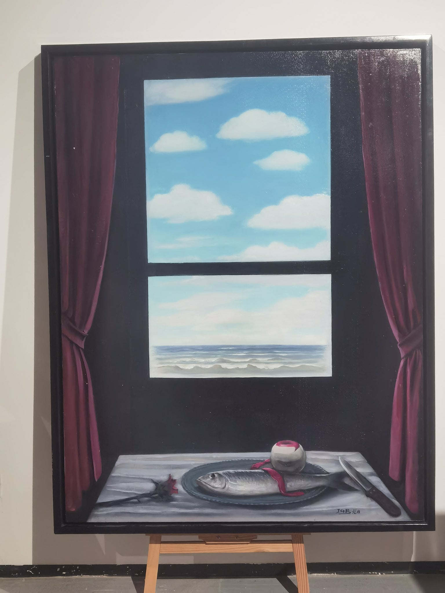 The artists employ a naturalistic yet stylized approach that bridges figuration with subtle surrealism. The clarity of the brushwork and the soft rendering of light evoke the quiet poetics of daily life, reminiscent of Giorgio Morandi’s intimate still lifes or Edward Hopper’s quiet interiors, while the beach view adds a cinematic openness. The precise yet restrained palette enhances the work’s contemplative tone, emphasizing mood over narrative.