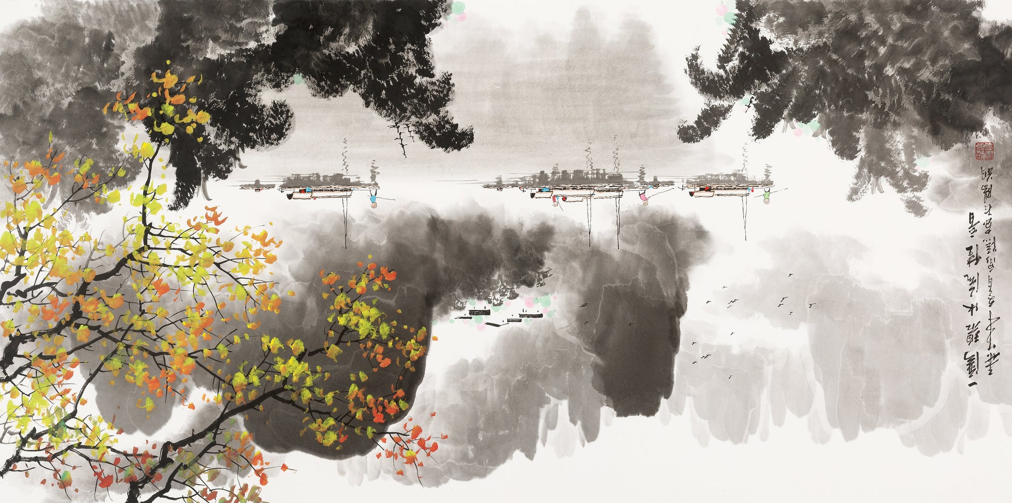 Quanzong Zhang’s A Bay of Blue Water to Keep Good News is a serene and detailed Chinese landscape rendered in ink and color on paper. Measuring 136 by 70 centimeters, the composition captures a harmonious natural scene: towering mountains in layered perspective, a calm bay with boats adrift, and intricately rendered trees and foliage throughout. The work’s Title: suggests auspicious symbolism, intertwining natural tranquility with themes of fortune and harmony.