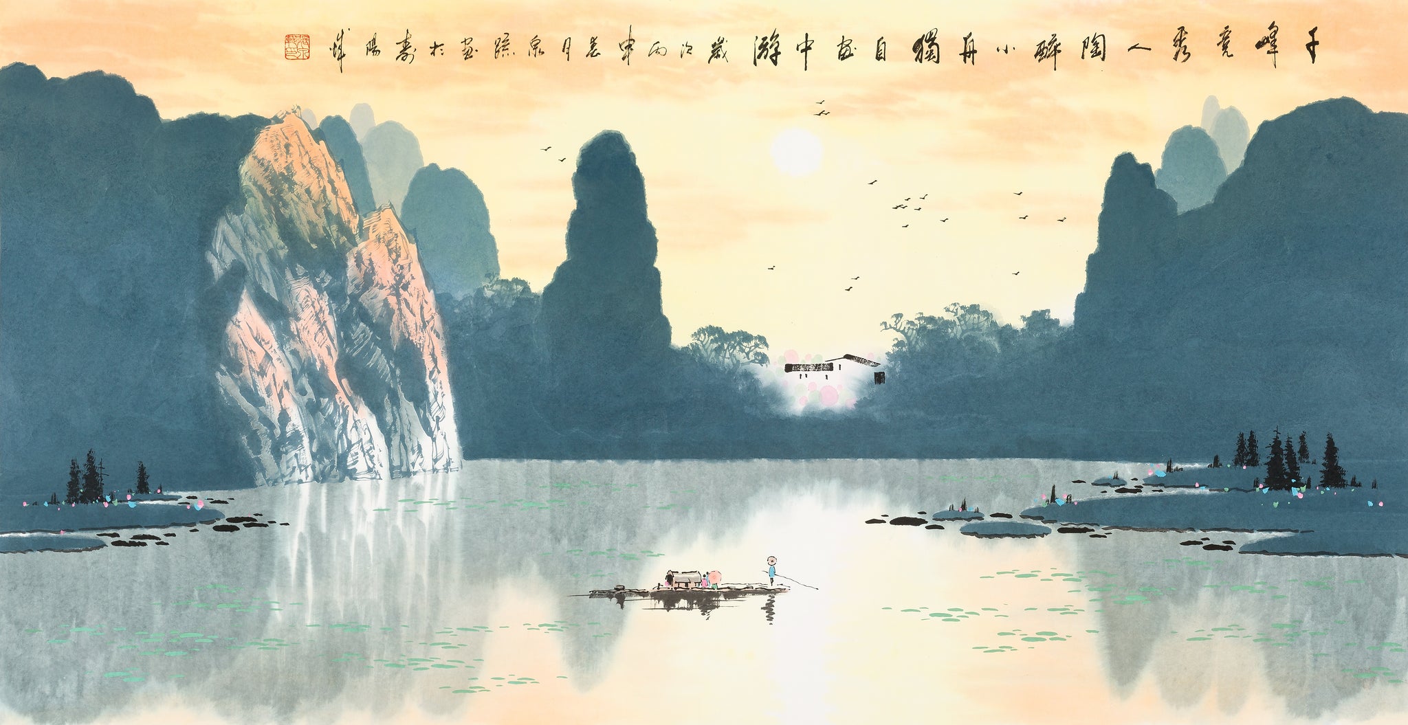 Quanzong Zhang’s A Thousand Peaks Competition Show Intoxicated People is a serene yet grand landscape painted in traditional Chinese ink and wash. The composition features a wide river bordered by towering, mist-veiled karst mountains. At the center, a lone raft carrying a figure drifts peacefully along the still water, its reflection mirrored below. The sky glows with the rising or setting sun, casting a warm hue over the tranquil scene. Birds soar overhead, and distant homes nestle between the peaks, suggesting a harmonious coexistence between humanity and nature.