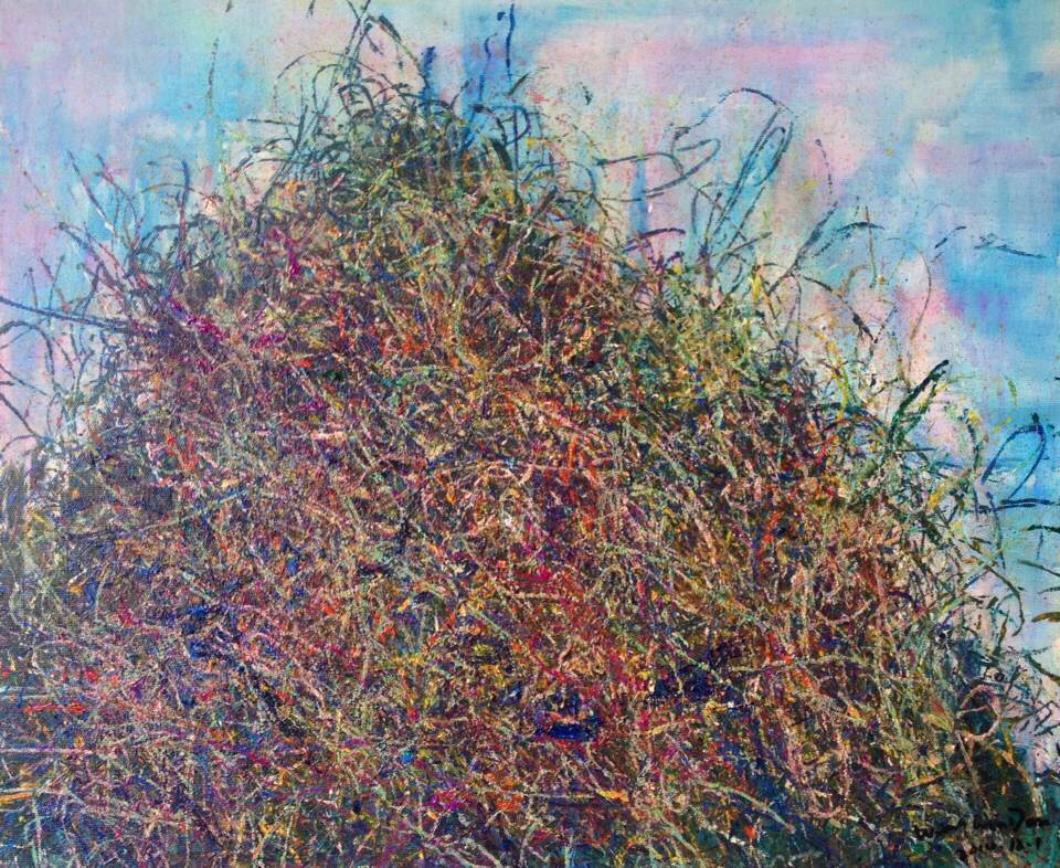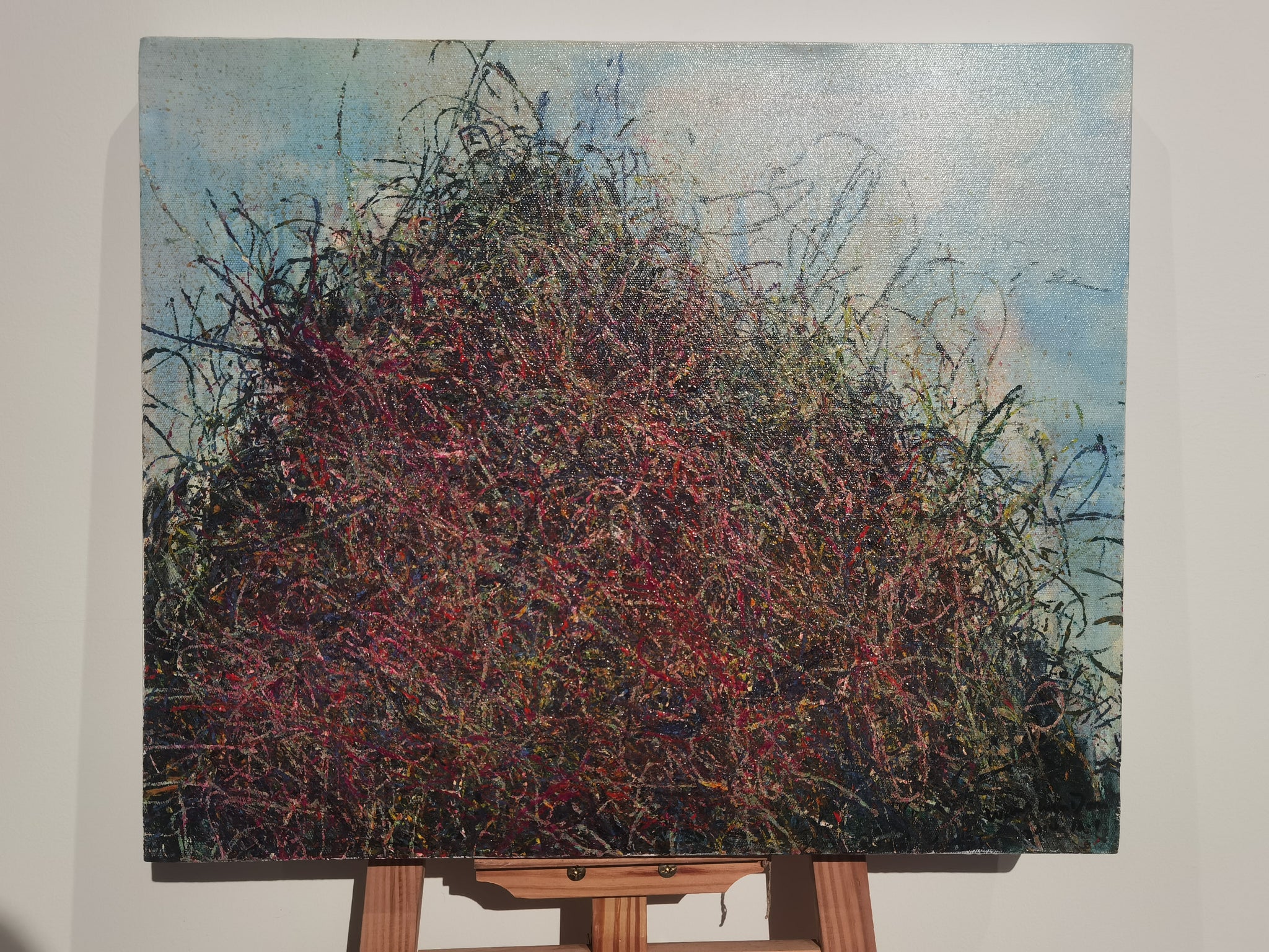 Rendered in an expressive, layered technique, A Sense of Autumn by Wendan Wang is a captivating oil on canvas that measures 50 x 60 cm. The painting features a densely woven hill-like form composed of gestural lines and intricate strokes, evoking a wild entanglement of grasses and brambles. The piece is characterized by a rich interplay of color, texture, and movement, with warm autumnal tones emerging from a haze of cooler hues.