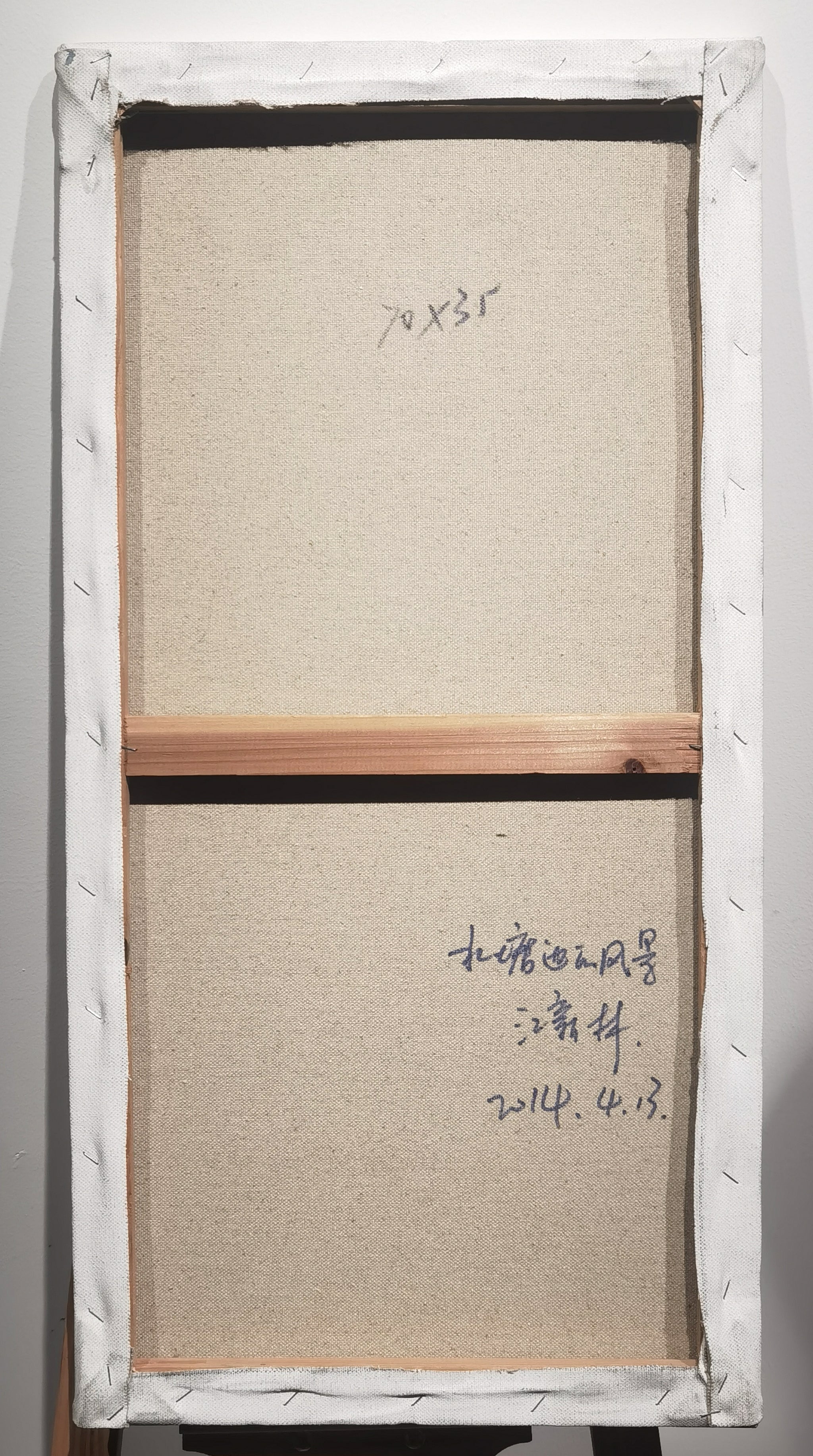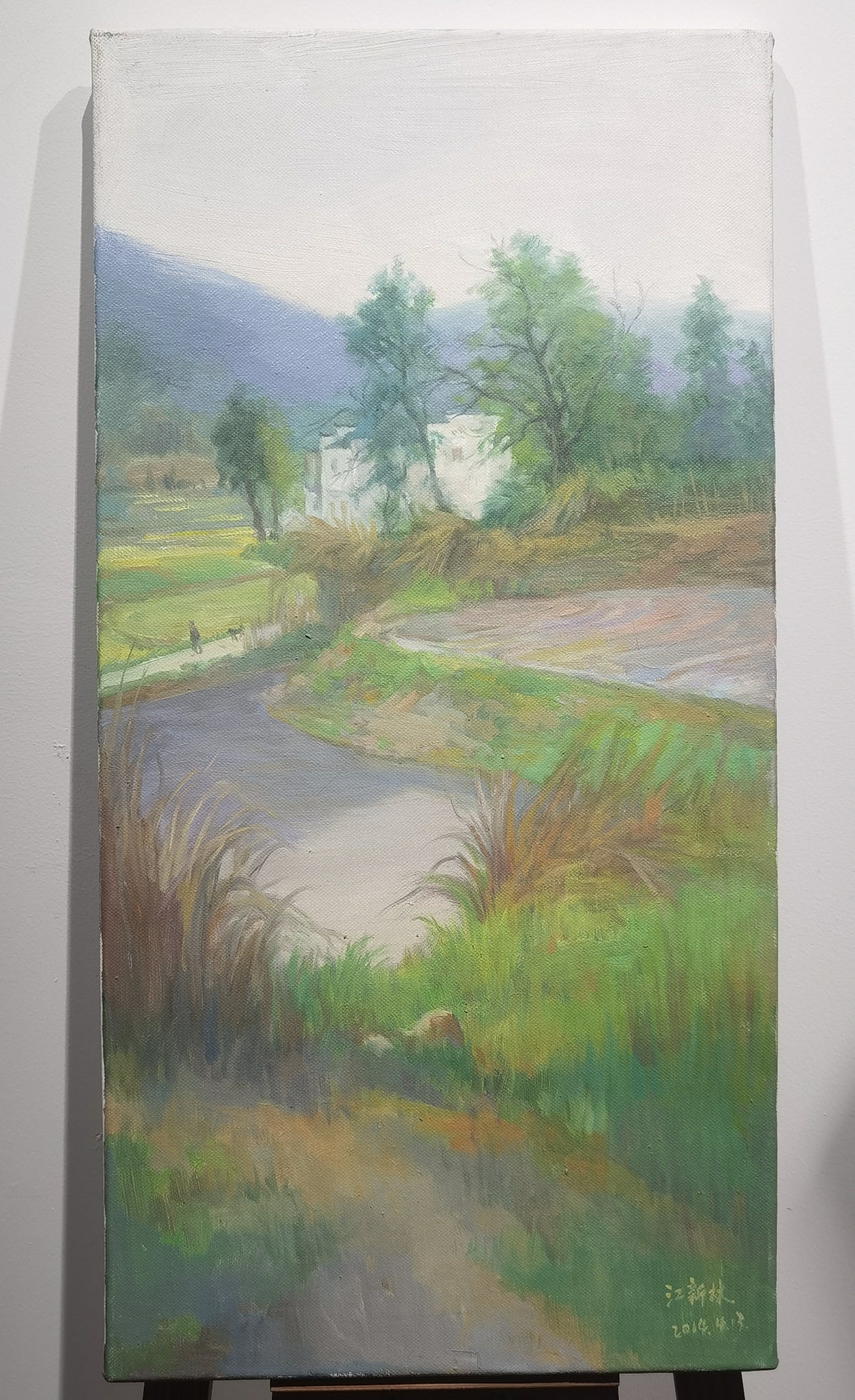 Executed in 2014, A View by the Pond is a vertical-format oil painting by Xinlin Jiang that captures a peaceful rural pathway winding past a reflective pond toward distant fields and a cluster of whitewashed houses. Measuring 70 by 35 cm, the composition draws the viewer gently into the distance, guided by a meandering road and softened edges of foliage, earth, and water. Jiang’s technique showcases a luminous palette dominated by greens, yellows, and lilacs, balanced by the delicate silhouette of trees against an expansive sky.