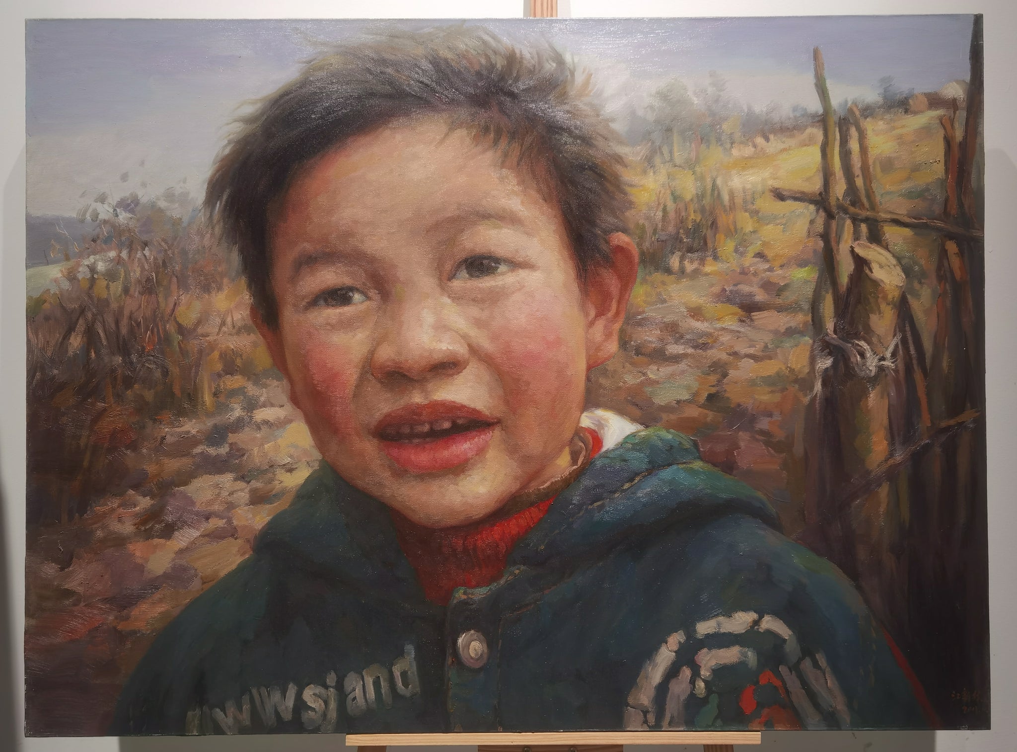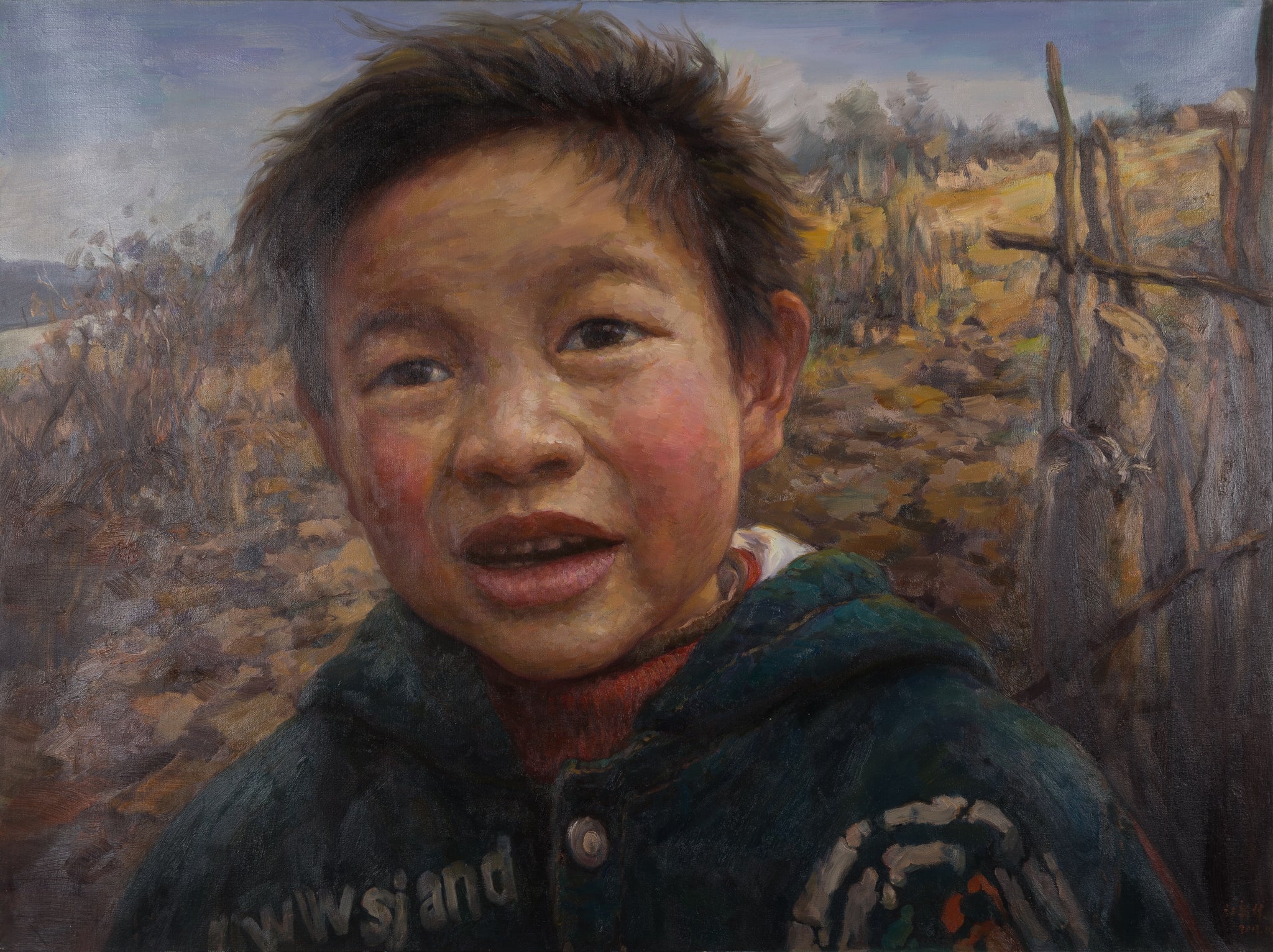 Yamriva is a vivid oil portrait by Xinlin Jiang, completed in 2011, measuring 90 by 120.5 cm. The composition features a young boy captured in the open countryside, his animated expression rendered with remarkable immediacy. The child's wind-chapped cheeks and tousled hair convey the rawness of rural life, while his oversized green jacket and candid gaze anchor the work in a deeply personal, tactile reality. The muted yet warm tones of the background—fields, bare trees, and wooden fences—enhance the subject’s connection to the land.