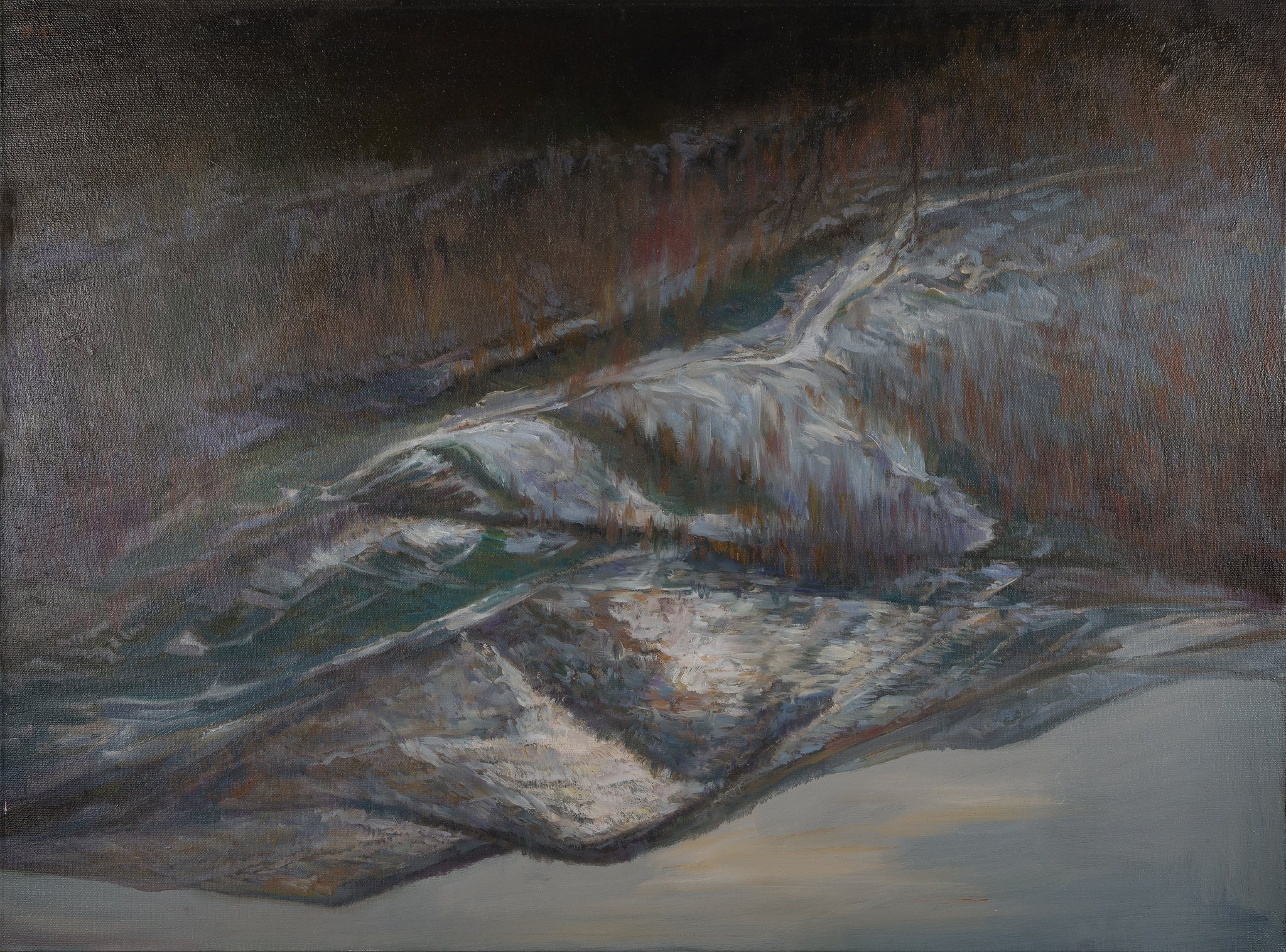 A Silver Col (2012) is a commanding landscape painting by Xinlin Jiang, rendered in oil on canvas and measuring 90 x 120.5 cm. The scene captures a rugged, snow-covered mountain pass—known as a "col"—with winding paths and frost-laced vegetation stretching through the valleys. The composition evokes a profound sense of geographical isolation and natural drama, conveyed through expressive brushwork and a brooding palette of blues, whites, and earthy browns.