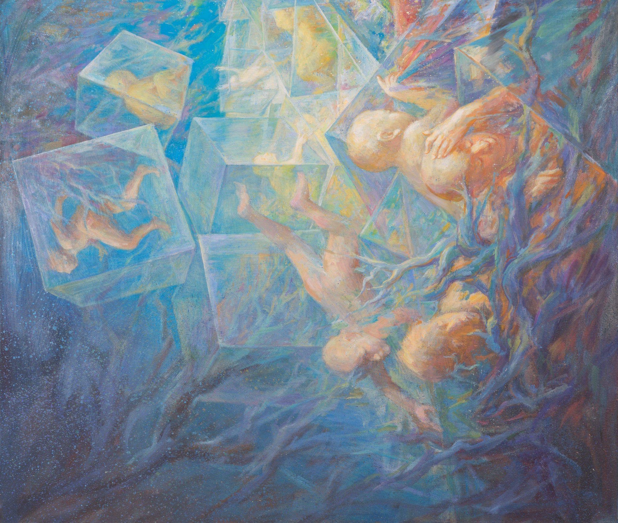 A Dream Journey Part 2 (Frame 1) is a compelling oil painting by Xinlin Jiang, executed in 2015. This large-scale canvas immerses viewers into a surreal dreamscape populated by childlike figures floating in and around translucent cubes. Interwoven with tree roots and streams of ethereal color, the painting suggests a metaphysical space suspended between confinement and awakening.