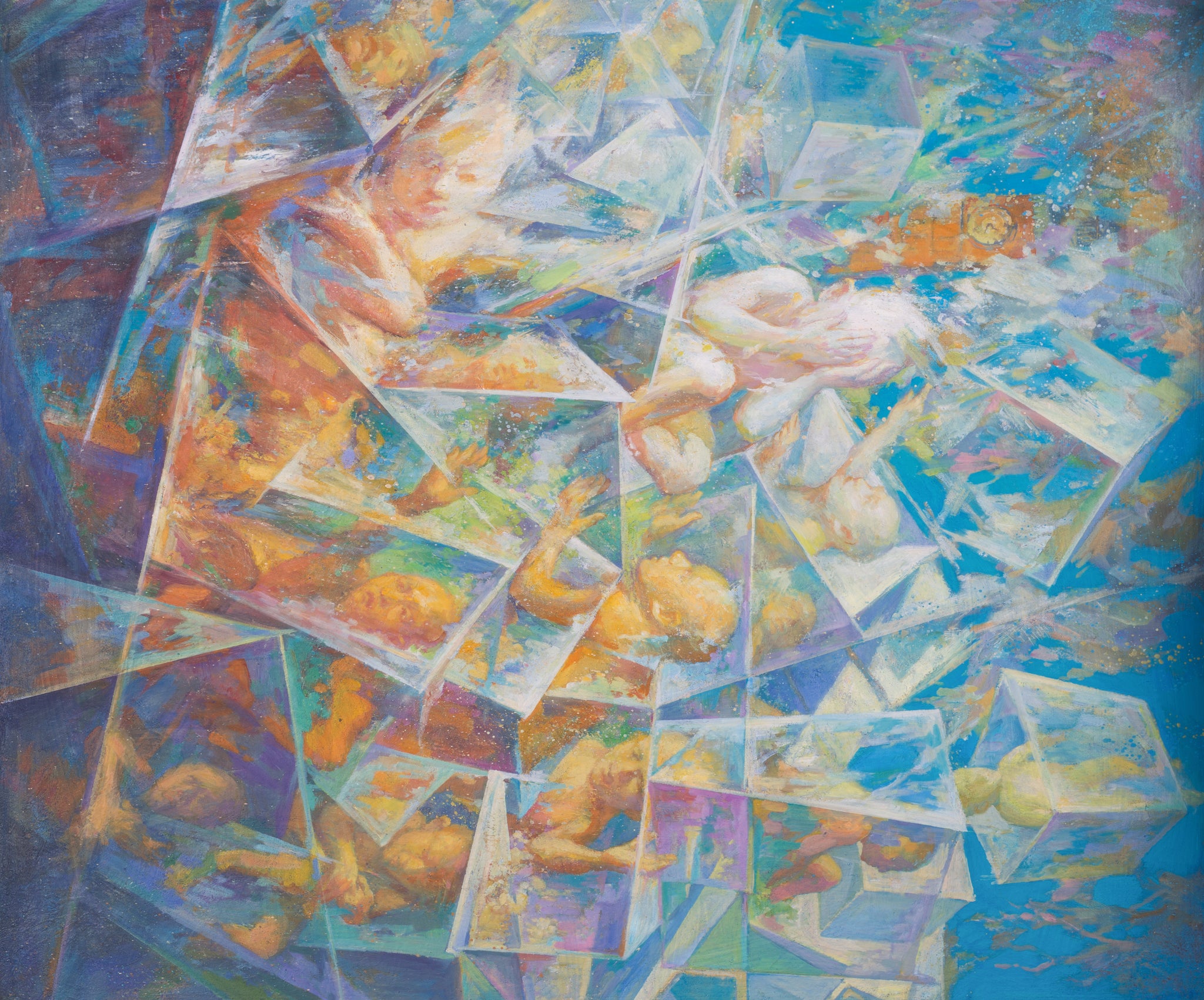 A Dream Journey Part 2 (Frame 2) continues Xinlin Jiang’s ethereal series, rendering a labyrinthine dreamworld of infant figures entangled in crystalline geometries. This large-format oil painting features overlapping transparent cubes, each housing ghostlike children frozen in moments of emotion, introspection, or interaction, with fractured reflections further intensifying the psychological complexity of the composition.