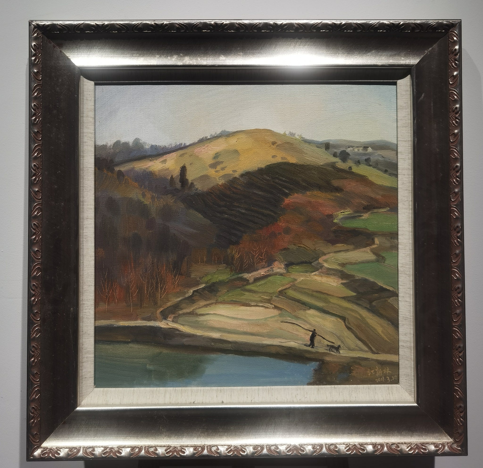 In A Small View of Mountain Village, Xinlin Jiang presents a serene yet vivid composition depicting a rural hillside bathed in warm, golden light. Executed in oil on canvas, the square-format work measures 50 x 50 cm and centers on a panoramic landscape where a lone figure and their dog traverse a path by the water's edge, flanked by terraced fields and a sun-dappled slope. The meticulous layering of color and shape underscores Jiang’s attentive observation and his emotive connection to the countryside.