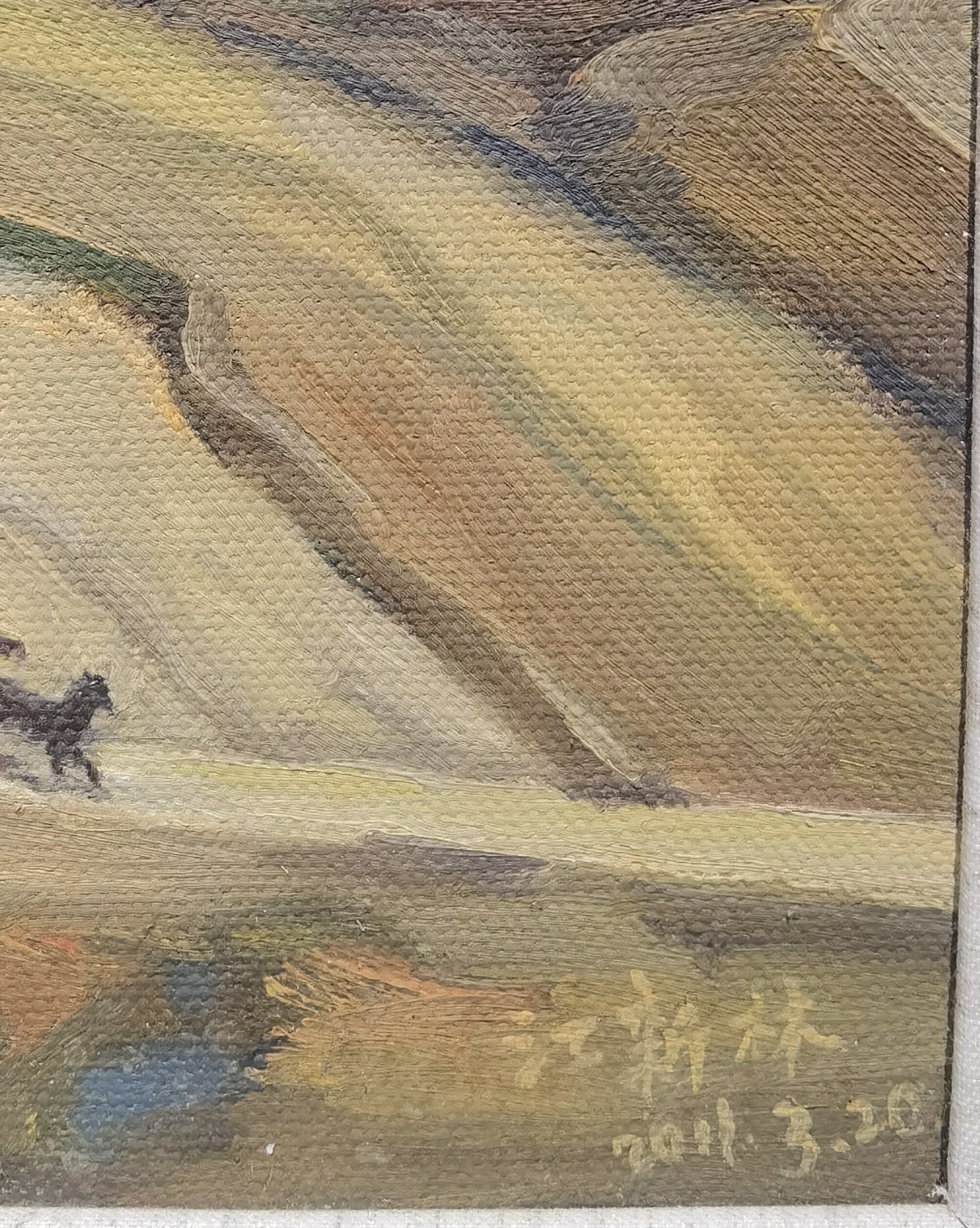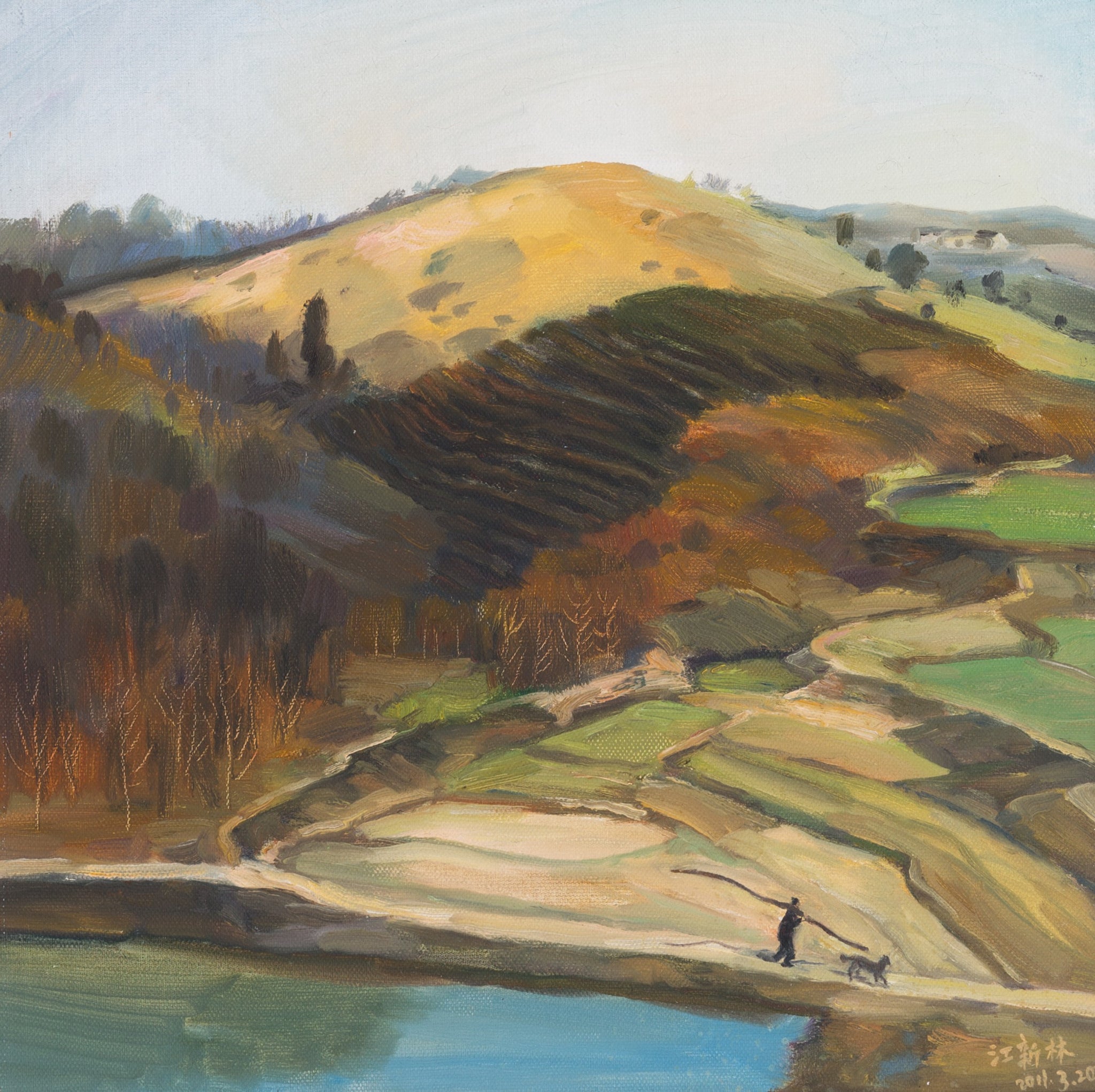 Painted in 2011, this work reflects Jiang’s broader project of documenting the traditional Chinese rural environment during a time of rapid urban expansion and modernization. As rural communities transformed or vanished altogether, Jiang’s paintings became quiet records of lived geographies, rooted in real places and moments. His choice of subject matter—untouched land, solitary walkers, and sunlit paths—captures both the poetry and pathos of a transitioning cultural landscape.
