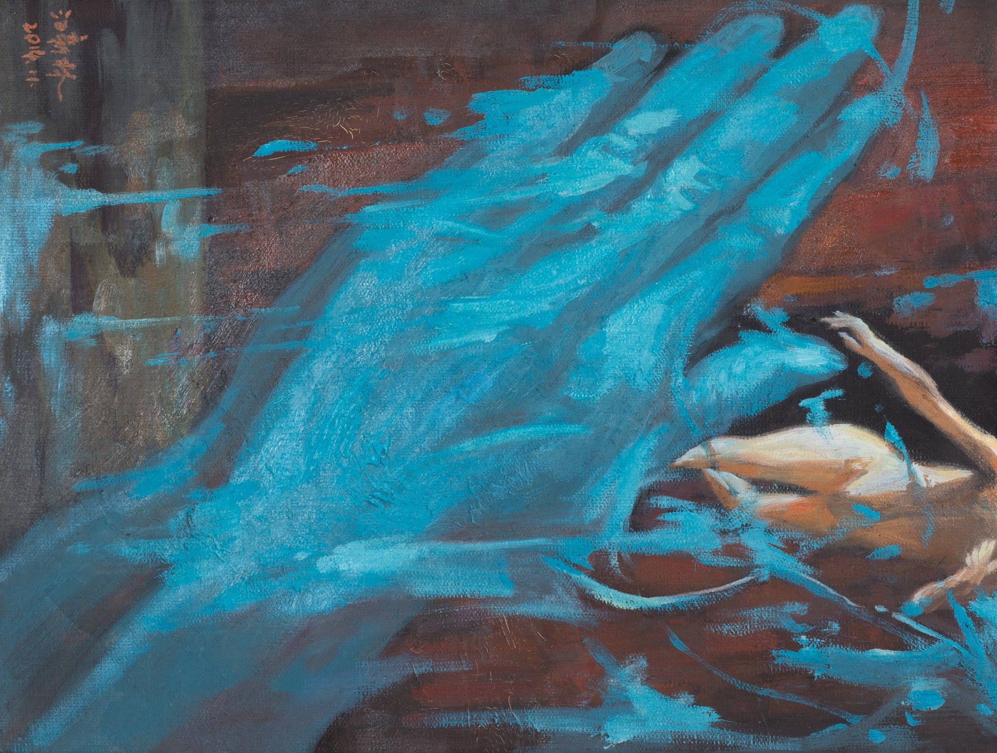 In You Can't Escape My Palm 6, Xinlin Jiang presents a vivid and psychologically charged composition in oil on canvas. Dominated by a luminous blue hand rendered in dynamic, gestural strokes, the image evokes a surreal confrontation between control and vulnerability. A partially nude figure is suspended above the hand, adding tension and narrative ambiguity to the scene. The compact format amplifies the intimacy and immediacy of the work.