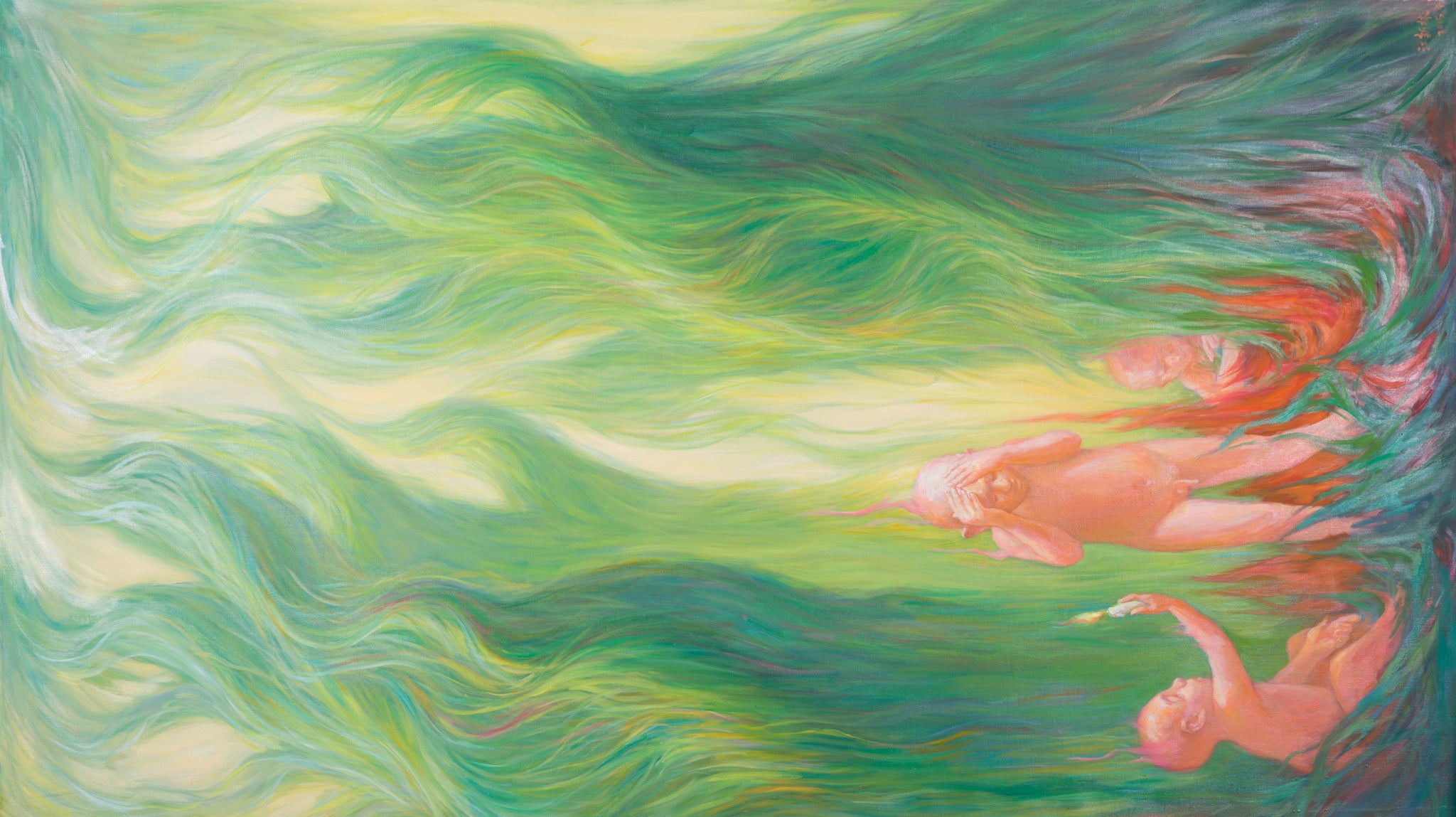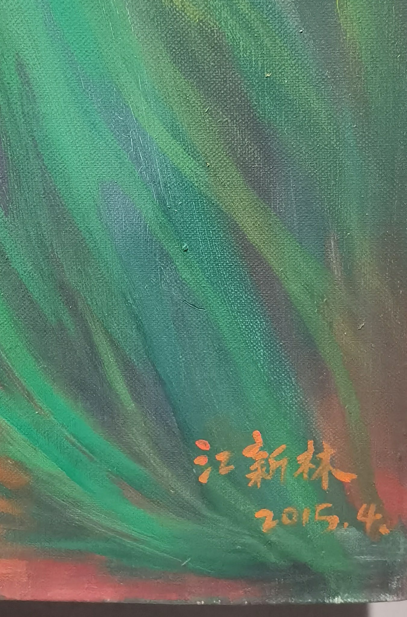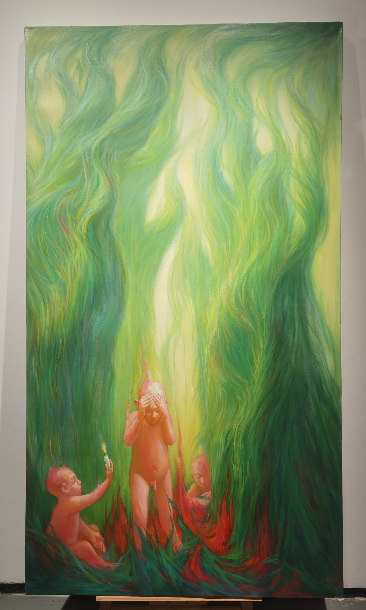 Jiang’s practice resides in a liminal space between Symbolism and contemporary surreal figuration. His expressive palette, especially the contrast between luminous greens and warm flesh tones, underscores his affinity for psychological metaphor. The eerie childlike figures are painted in a style recalling both Neo-Expressionism and traditional Chinese scroll painting, while the compositional energy nods to the movement of Art Nouveau and the emotive strategies of artists like Yoshitomo Nara or Odilon Redon.