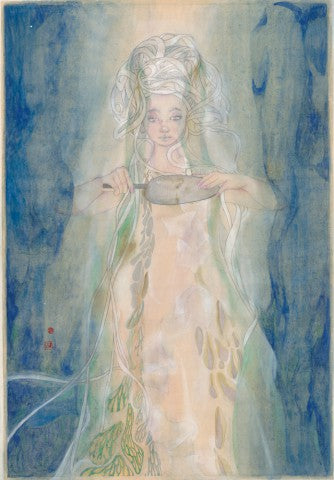 Alarm Illusion by Quan Zou is an evocative mixed-media work on paper, measuring 105 × 76 cm. The composition centers on an ethereal female figure, delicately rendered with translucent layers and soft tonal gradations. She appears to hold an undefined object, introducing a sense of mystery and psychological depth. The muted palette and atmospheric treatment contribute to the work’s dreamlike quality.