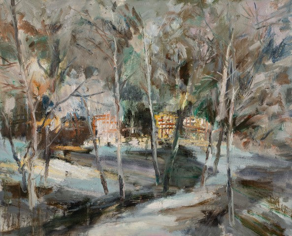 Winter Solstice Festival is a 100 × 80 cm oil painting by Guozhong Zhang, capturing a vibrant winter landscape. The composition emphasizes the interplay of natural elements, focusing on the colorful reflections of the sky on snow-covered ground and the presence of lingering autumnal foliage. The artist’s nuanced use of light and color evokes the transitional atmosphere of the season.