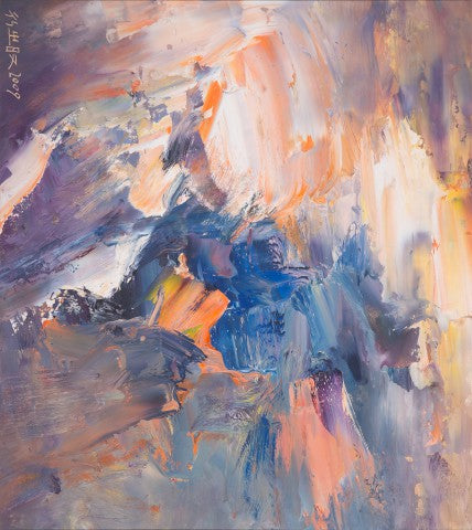 9.1937 Untitled by Zhirou Chen is a vibrant oil on canvas work, measuring 17.3 x 15.7 inches (44 x 40 cm). The composition is characterized by its dynamic interplay of warm and cool hues—orange and yellow tones colliding with deep blues and purples—creating a sense of movement and expressive intensity. Bold, sweeping brushstrokes dominate the surface, emphasizing the materiality of the Medium: and the artist’s gestural approach.