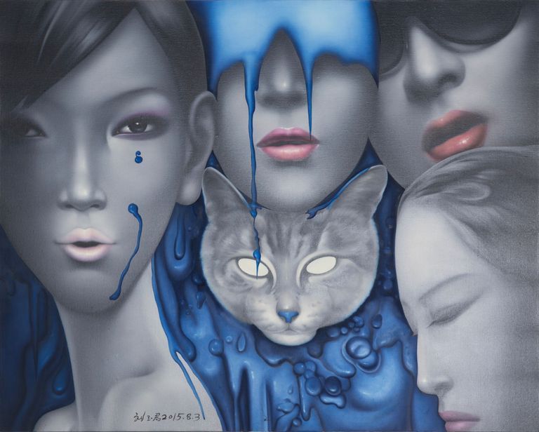 Unidentified Liquid (2015) presents a surreal and haunting tableau in which hyper-realistic faces, suspended in emotional ambiguity, are enveloped in flowing blue liquid. Central to the composition is a spectral feline figure with glowing, pupil-less eyes, nestled among disembodied heads that shift between serenity and unease. Liu Yujun’s meticulous brushwork and airbrushed gradations render the subjects with eerie clarity, crafting an image at once emotionally seductive and psychologically disquieting.
