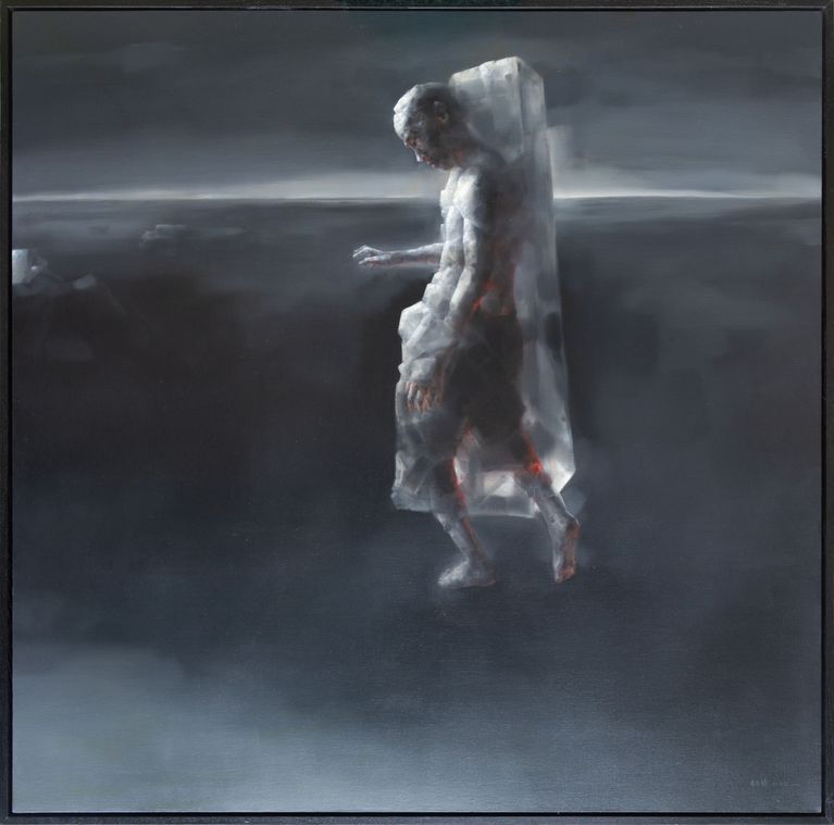 Watchman NO.4 – Walk Alone is a hauntingly introspective oil painting from Chen Jianfeng’s acclaimed Watchman series. The composition features a solitary male figure, partially crystallized and abstracted, striding forward across a desolate, dimly lit expanse. His body—flickering between corporeal form and spectral distortion—is wrapped in a translucent shroud of fractured geometry. The glowing edges and deep shadowing imbue the figure with an otherworldly aura, drawing attention to the silent resilience of the individual.