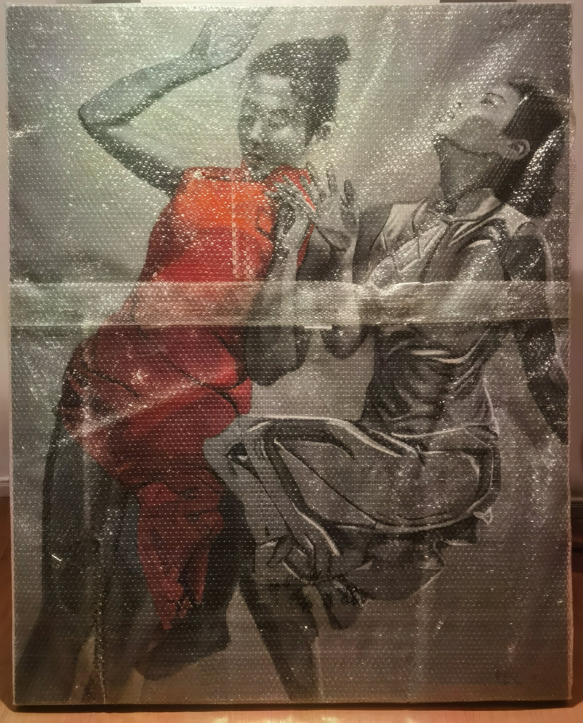 In 401 of the Contact, Jin Yu masterfully depicts two female figures frozen in a moment of expressive movement, one rendered in grayscale and the other in vibrant red. The interplay of stillness and motion, contrast and harmony, captures the dualities of human emotion and identity. The figures’ dynamic poses and intricate garments evoke a narrative of internal dialogue or cultural tension, inviting the viewer into a complex visual choreography.