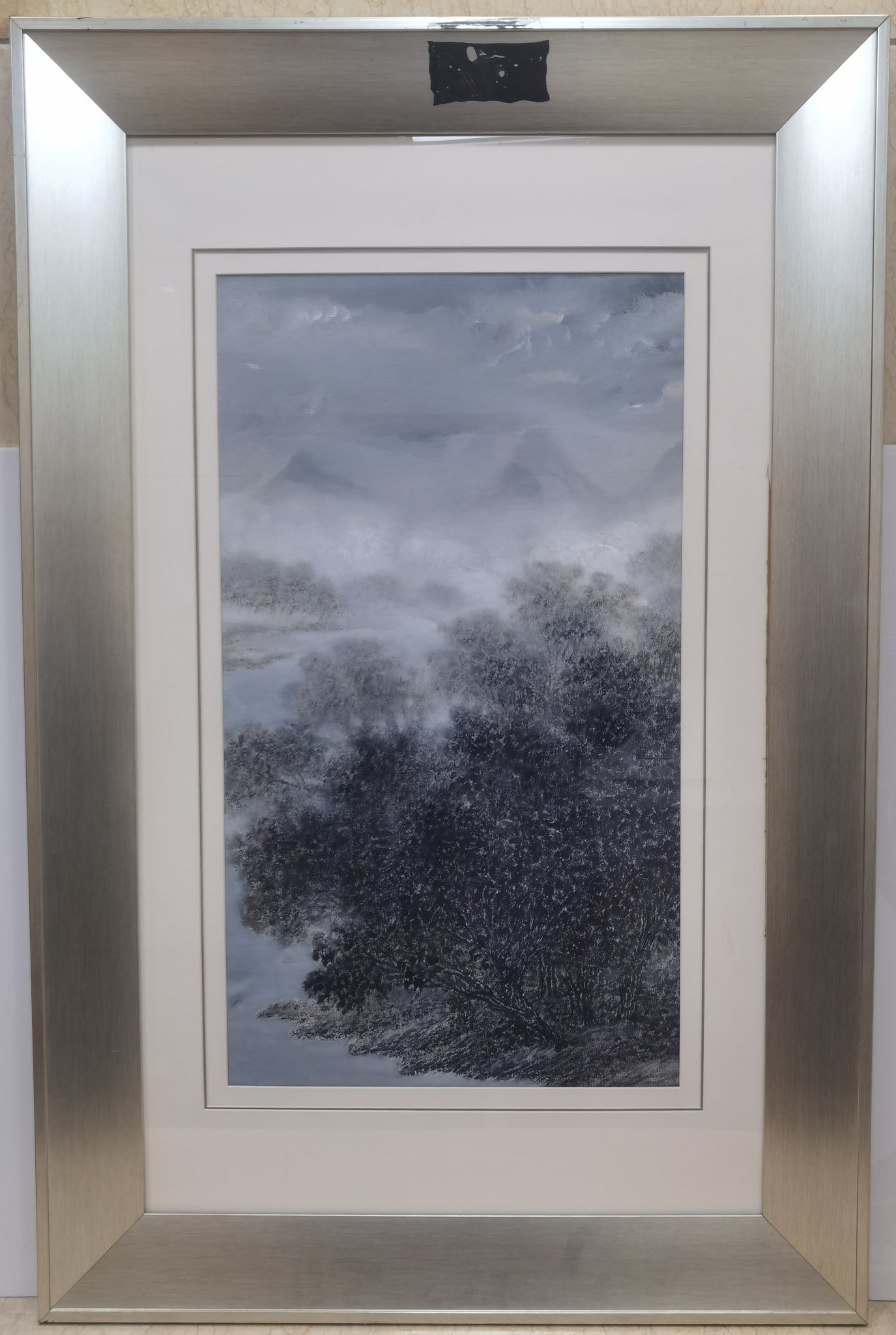 This serene oil painting by Gao Huijun, Title:d Sketch 1, presents an ethereal mountain landscape shrouded in mist. Executed in subdued monochromatic tones, the work captures the quiet majesty of nature through intricate brushwork and tonal depth. The painting is elegantly framed, emphasizing its contemplative atmosphere.