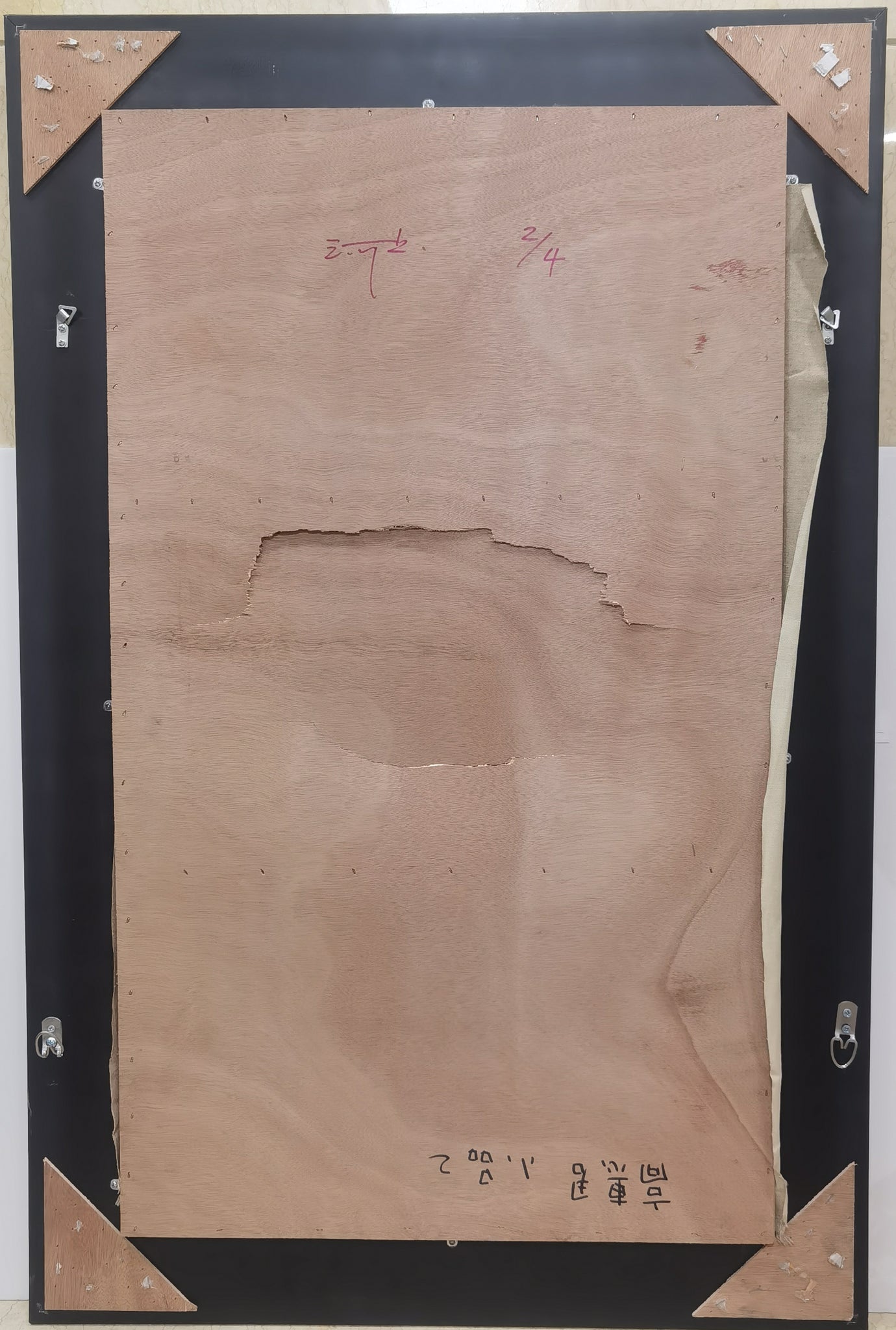 The painting itself is in very good condition. There is a tear in the wooden backing panel of the frame (visible in the verso image), but this does not affect the integrity or display of the artwork.