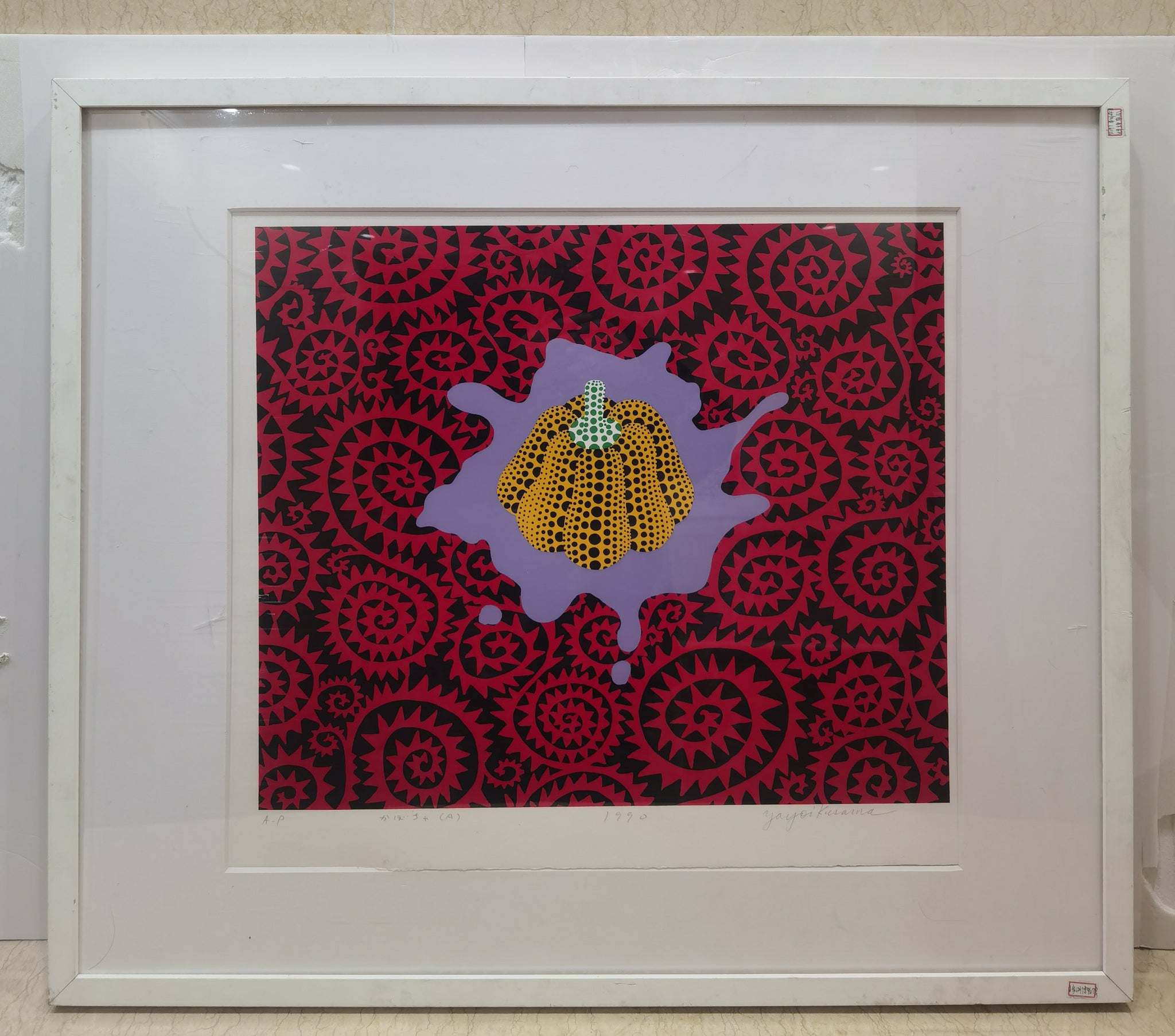 Brilliant Pumpkin is a vibrant print by Yayoi Kusama, one of the most celebrated and visionary figures in contemporary art. Executed on paper and professionally framed, this work features Kusama’s iconic pumpkin motif, adorned with her signature polka dots. The composition bursts with optical rhythm and hallucinatory precision, highlighting the artist’s enduring exploration of repetition, pattern, and biomorphic form. The image radiates a hypnotic intensity, a visual manifestation of Kusama’s fascination with infinity and self-obliteration.