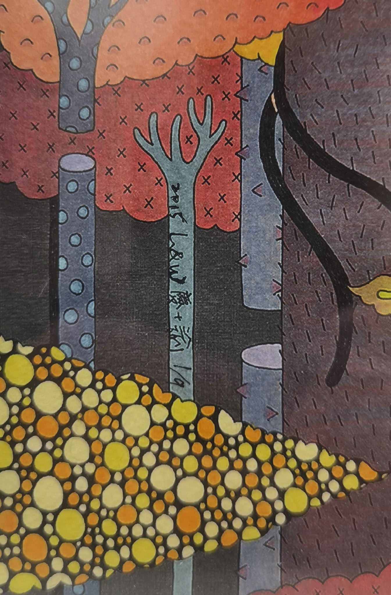 This Untitled 2015 print by the Taiwanese artist duo LIN Yu-Ching and WEI Hsin-Yu presents a stylized forest landscape where a prominent gray circular form overlays a vibrant, densely packed field of treetops. Rendered in meticulous textures and saturated autumnal tones—rust red, mustard yellow, moss green—the forest evokes both a whimsical and meditative quality. The sphere at the center, filled with sinuous linework and tiny motifs, suggests an alternate realm or hidden inner world embedded within the outer environment.
