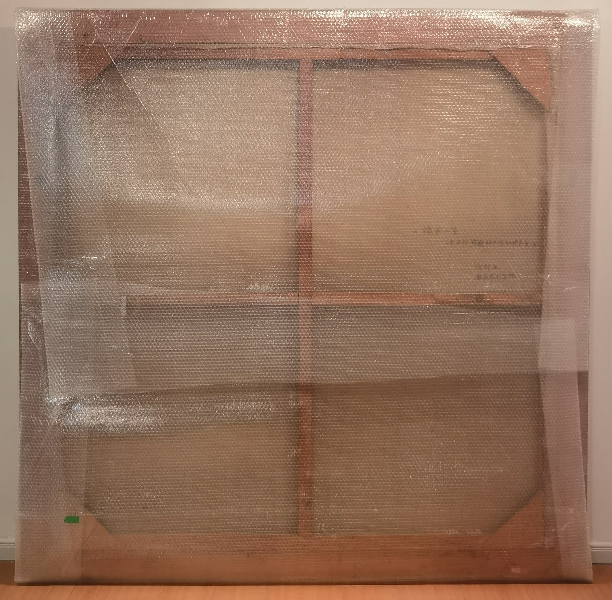 The work is preserved in a custom frame and remains in excellent condition. The canvas surface shows no visible abrasions, warping, or pigment loss. The glass is clear, with minor handling marks on the frame consistent with careful long-term storage. There is no evidence of restoration or structural concerns, and the canvas tension is secure.