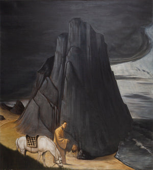 In Monk, Pan Guanqun presents a haunting and meditative composition featuring a lone figure in saffron robes standing before a towering, monolithic cliff face beside a somber seashore. A white horse grazes nearby, its presence grounding the surreal tableau. A partially buried sculptural head at the base of the cliff introduces an enigmatic, mythological dimension.