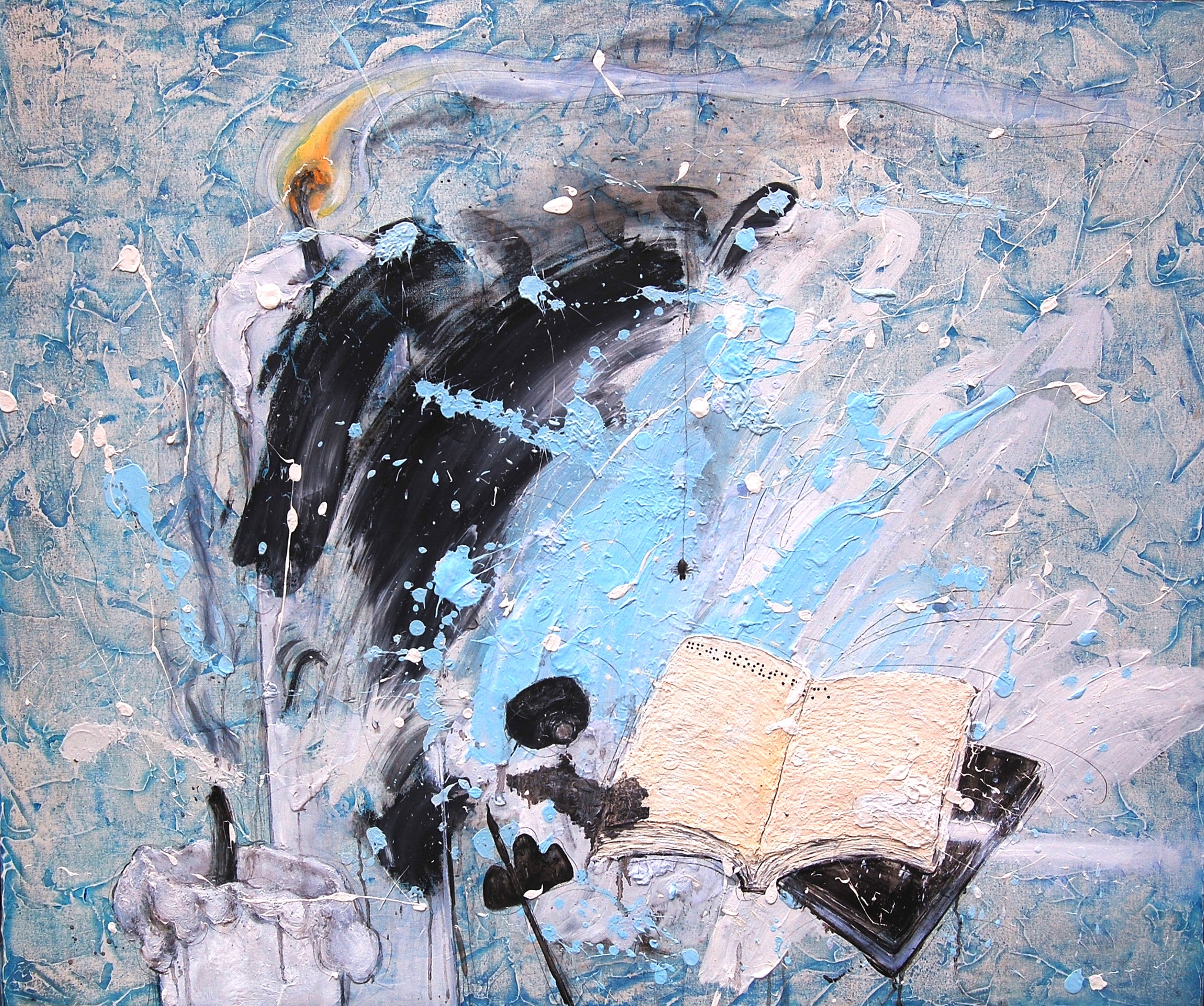 This work continues Li Xiaoqi’s exploration of surrealism and psychological symbolism, embracing a more lyrical abstraction than in some of his darker figurative pieces. The textured application of paint and rhythmic brushstrokes echo techniques of Tachisme and Abstract Expressionism, while the motif of a burning candle and open book infuses the composition with themes of memory, transience, and inner reflection. Li’s approach here is both poetic and deeply introspective, marking a departure from overt figuration toward symbolic suggestion.