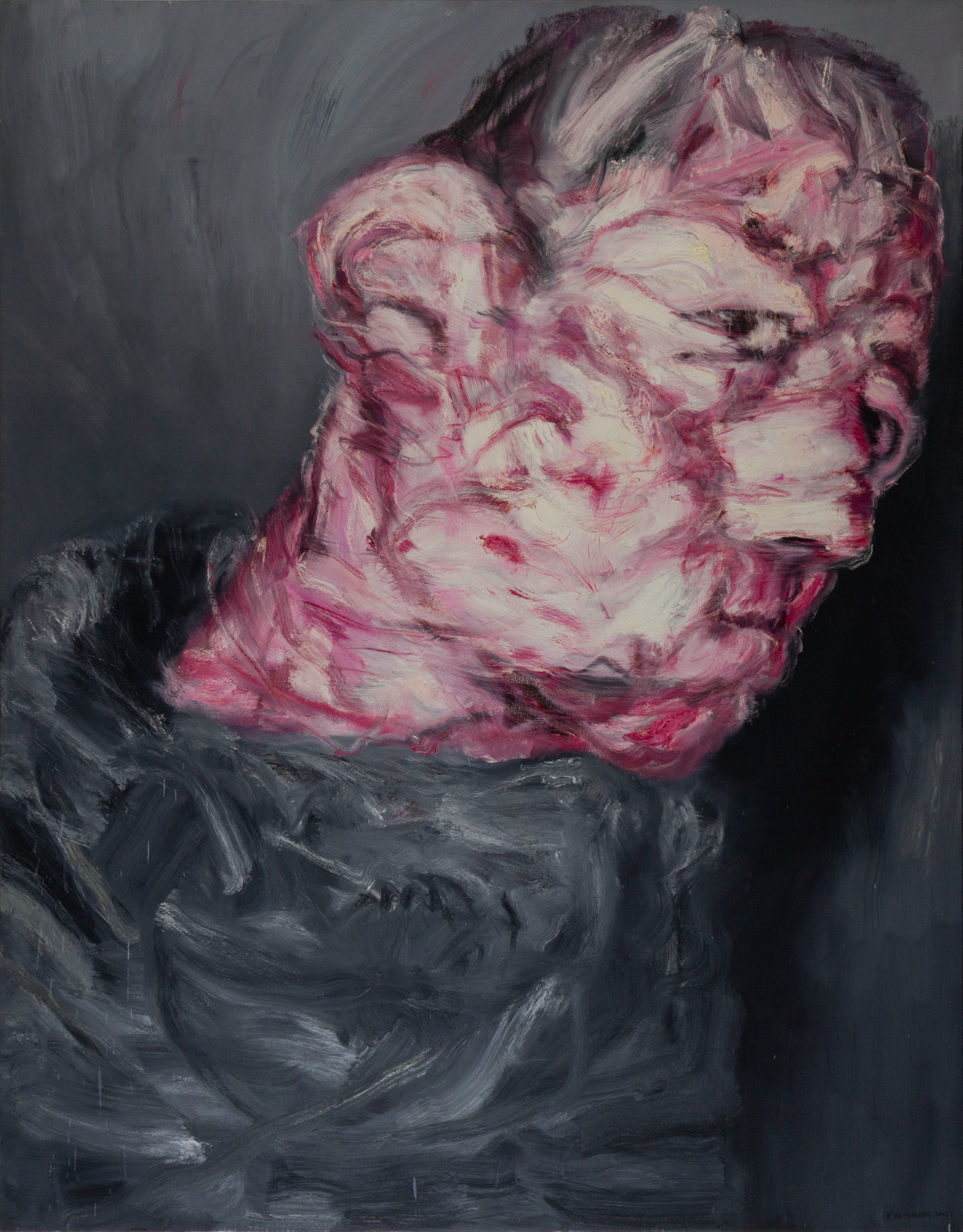 Phantom 1 is a striking oil painting by Chinese artist Zhao Nengzhi, executed in 2007. The work portrays a distorted and spectral male bust in profile, rendered in a visceral blend of fleshy pinks, reds, and cool grays. The paint is applied with sweeping, forceful gestures, giving the figure a sense of psychic fragmentation and emotional turbulence. The artist’s expressionist handling of oil imbues the portrait with a haunting corporeality, evoking both pain and resilience.