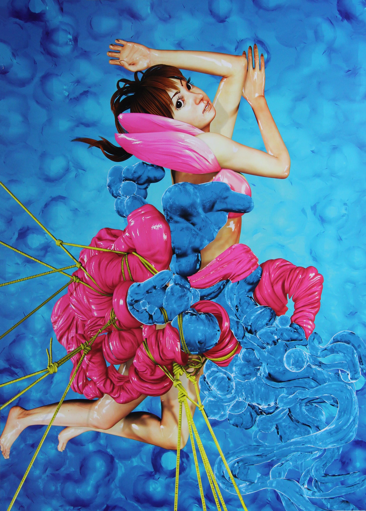 In Alice, Liu Min presents a hyper-realistic and fantastical image of a female figure suspended within a surreal landscape of inflated textures and vibrant color. The composition, striking in its chromatic intensity and anatomical precision, blends pop-surrealist elements with a psychological undercurrent. Rendered in oil on canvas, the painting captures a moment of expressive suspension—ropes tether the central figure as she is wrapped in an amorphous, glistening mass of pink and blue organic forms. The result is an unsettling yet visually mesmerizing scene.