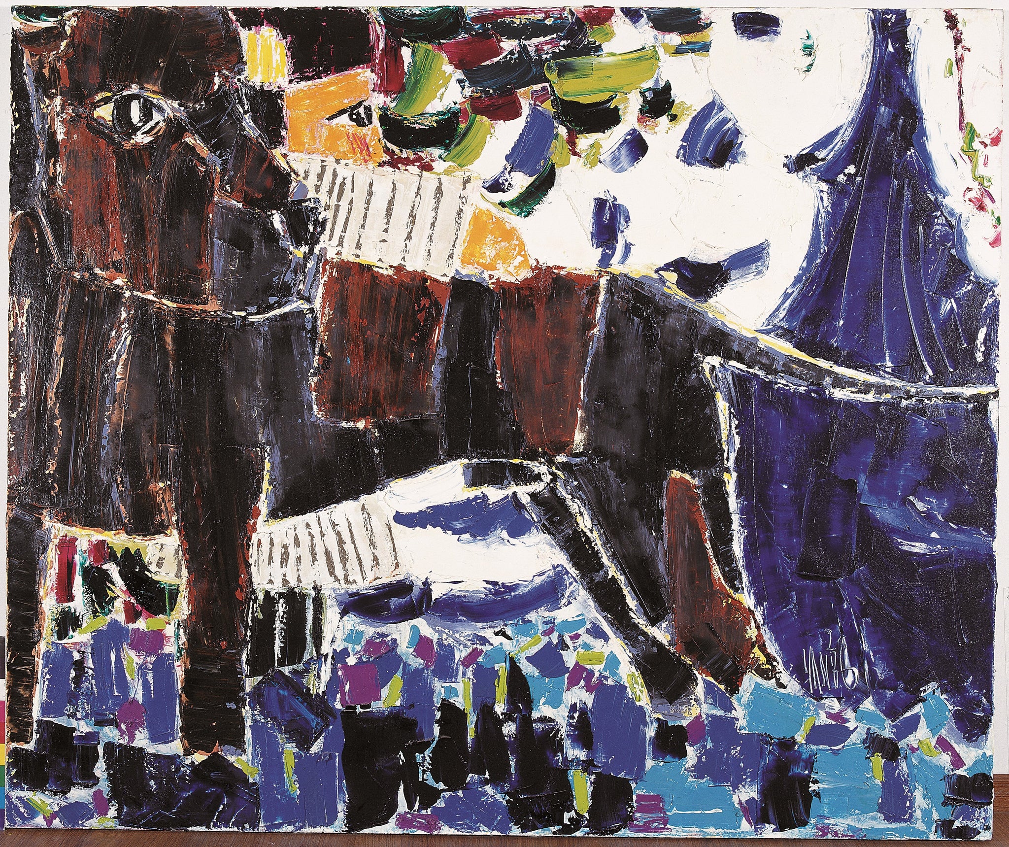 Accompanying is a vivid and gestural oil painting by Yan Bo, rendered in a striking combination of earthy browns, deep purples, and vibrant blues. The composition appears to suggest the form of a four-legged creature, possibly a dog, emerging through a patchwork of abstracted, blocky color fields. A large, penetrating eye is one of the key focal points, anchoring the figure within a dense, expressionistic landscape. The textured, layered application of paint adds a sculptural quality to the surface, consistent with the artist’s characteristic emphasis on physicality.