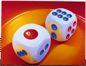 This striking oil on canvas by Chen Wenbo, Title:d Good Luck, exemplifies the artist’s mastery of hyperrealistic precision and saturated color. The composition features two white dice, their gleaming surfaces sharply contrasted against a glowing amber-red ground. Each die is rendered with meticulous attention to reflection, curvature, and chromatic interplay—red, blue, and yellow hues working in balance to produce an almost surreal vibrancy. The magnified scale of these everyday objects draws the viewer into a world that is both familiar and curiously otherworldly.