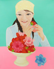 Strawberry Cake by Yang Fan is a vibrant and meticulously rendered oil on canvas, depicting a smiling young woman with a yellow kerchief, holding a lollipop and a strawberry, while seated behind an ornate bowl overflowing with strawberries and stylized flower blossoms. With its pastel palette and precise detailing, the painting presents an image of cheerful femininity steeped in youthful exuberance. Executed in 2005, the work measures 100 by 80 cm and exemplifies Yang’s signature clean lines and smooth surfaces.