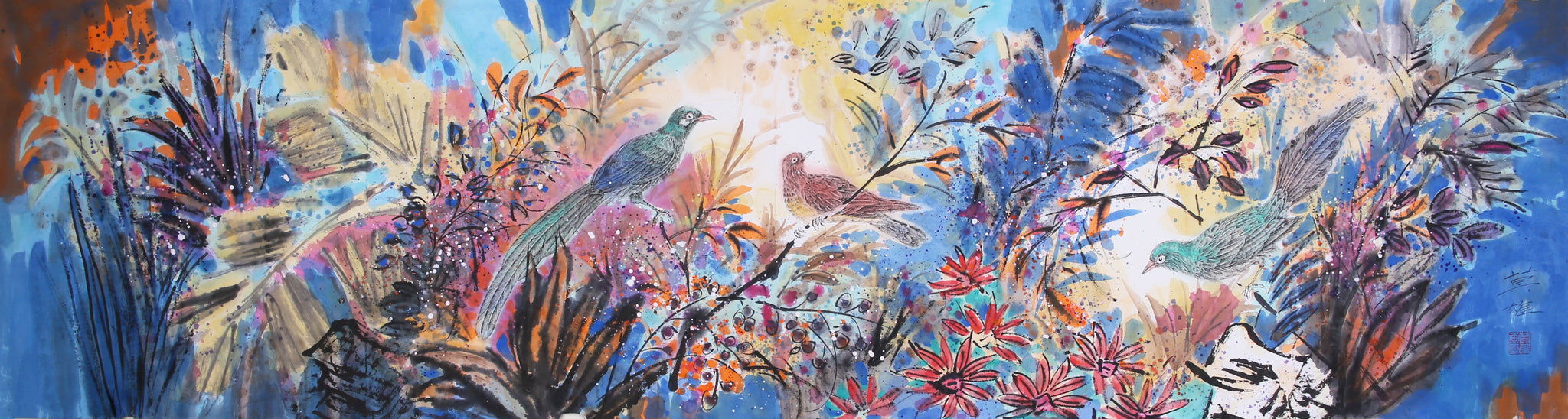 A Play Between Flowers is an expansive, horizontal composition that bursts with dynamic color and energy. Mo Xiong orchestrates an exuberant floral landscape teeming with life, texture, and movement. Amidst the expressive foliage and blossoms, playful birds flit between branches, enlivening the scene with a sense of narrative motion. The work exemplifies the artist's deft balance between spontaneity and structure, resulting in a composition that feels both rhythmic and lyrical.
