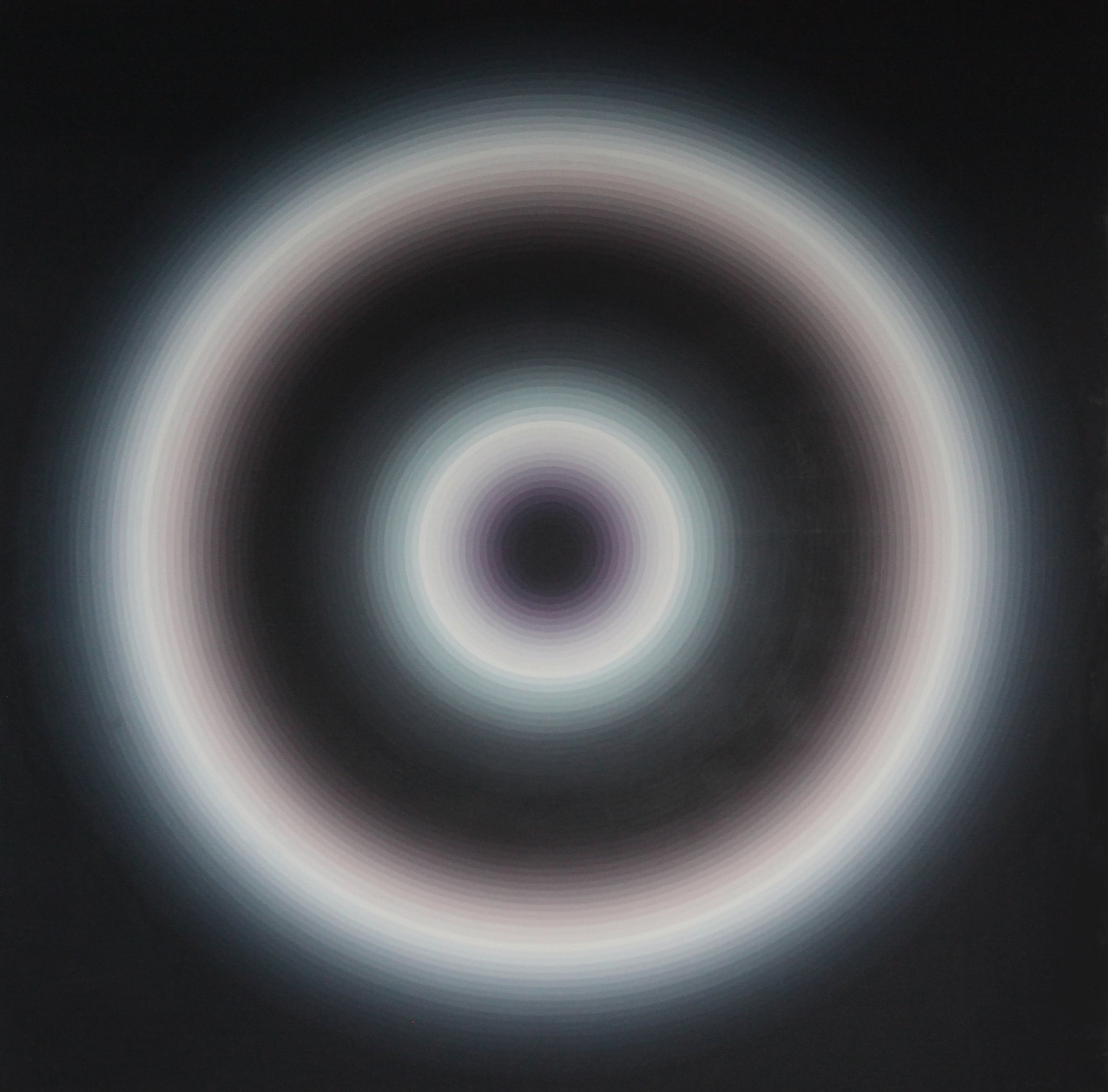 This monumental oil painting by Yan Lei—measuring 300 by 300 centimeters—features a tightly structured series of concentric rings in varying tones of gray, off-white, and pale silver. These rings are densely packed, subtly layered, and gradually fade in intensity as they move outward, creating an immersive and almost three-dimensional optical effect. At the center of the composition is a small, dark indigo or purple circle that anchors the entire visual field. Set against a darker backdrop, the luminous, expanding rings appear to pulse outward in soft, measured rhythms. The work is framed and exhibition-ready.
