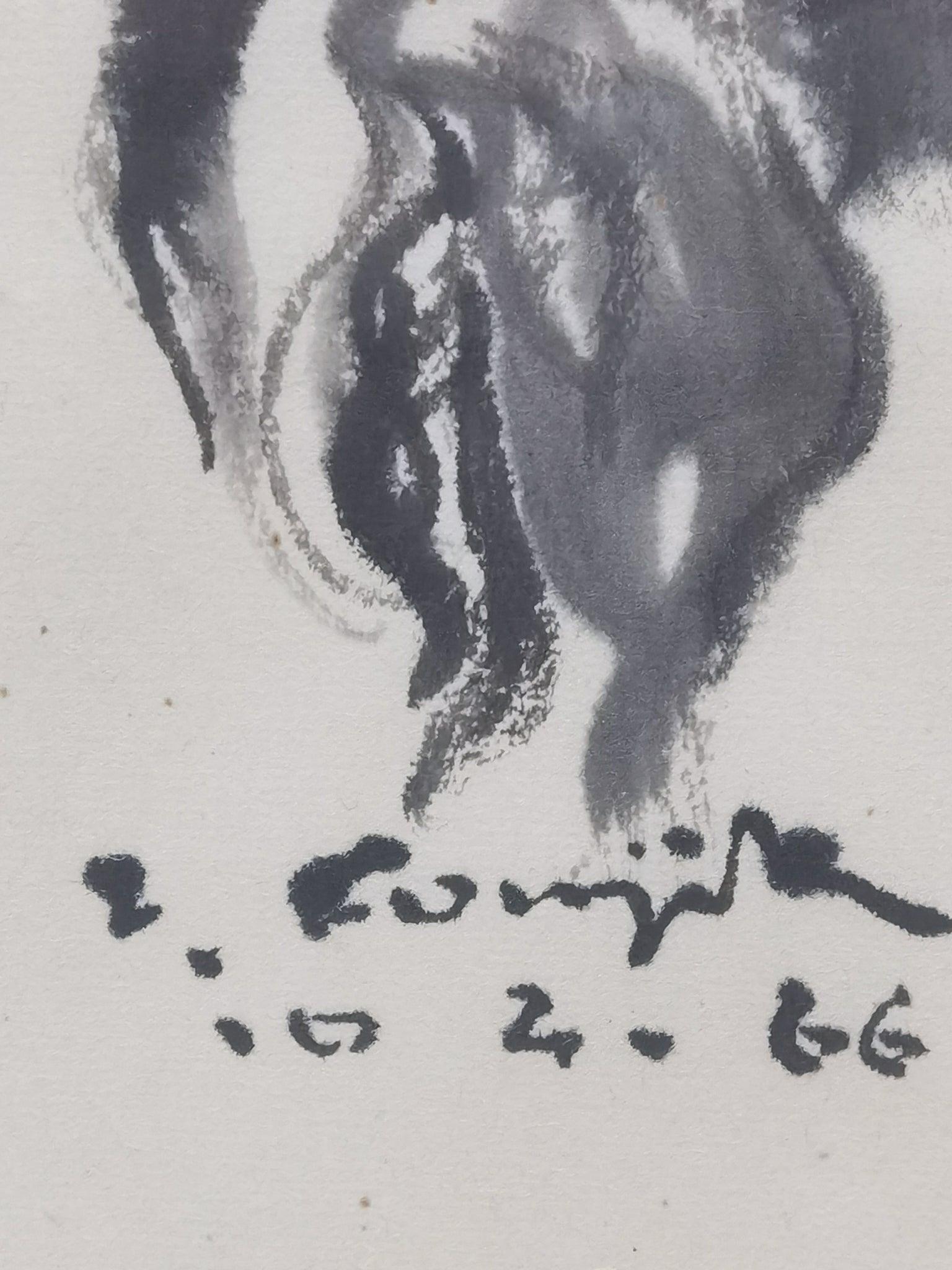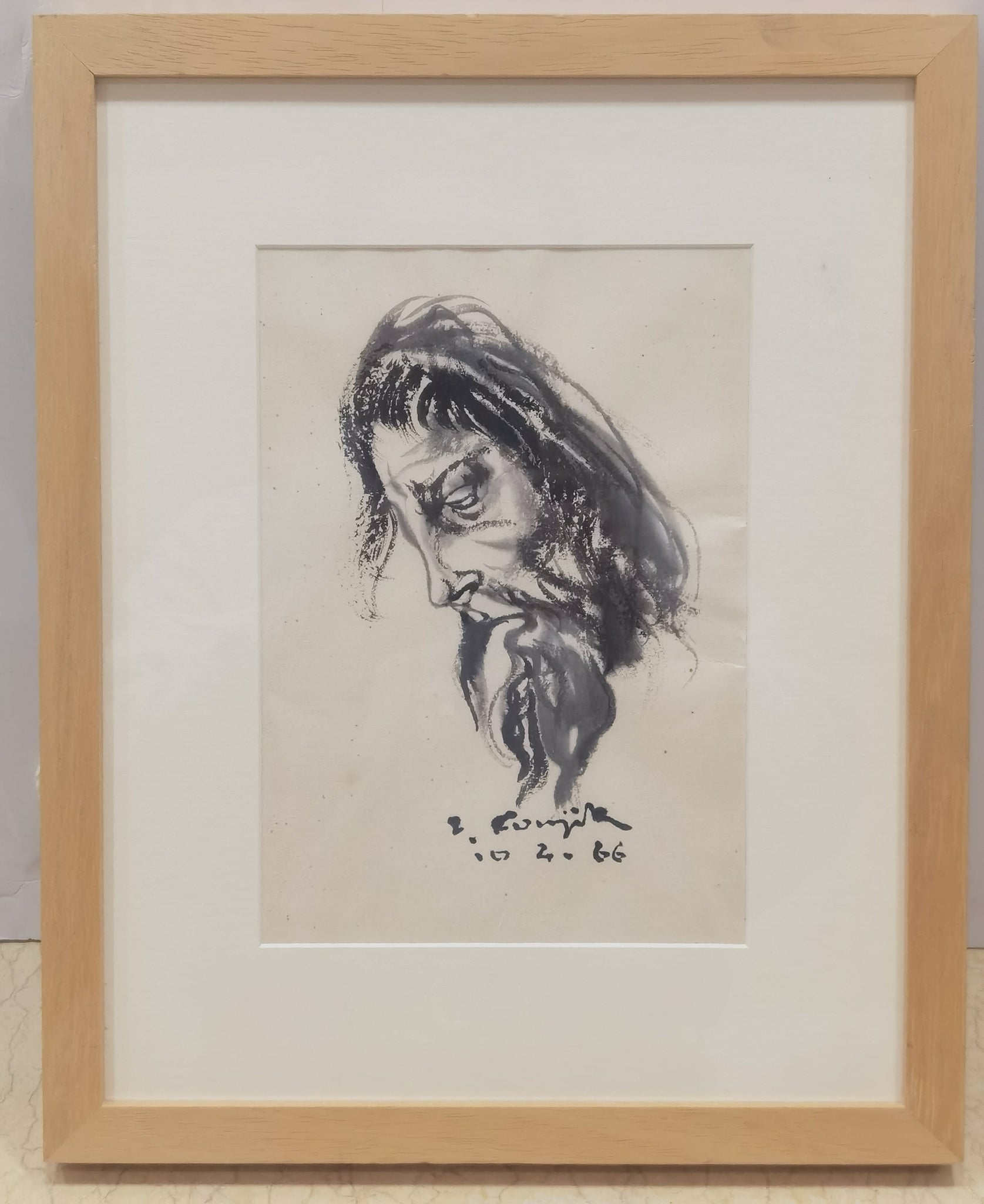 This expressive monochromatic portrait, Title:d Christ Head, features a somber depiction of Jesus Christ rendered in a bold and fluid graphic style. Signed and dated “10.2.66,” the composition focuses on Christ’s anguished expression, conveyed through gestural brushwork and stark contrasts that highlight the contours of the face and hair.