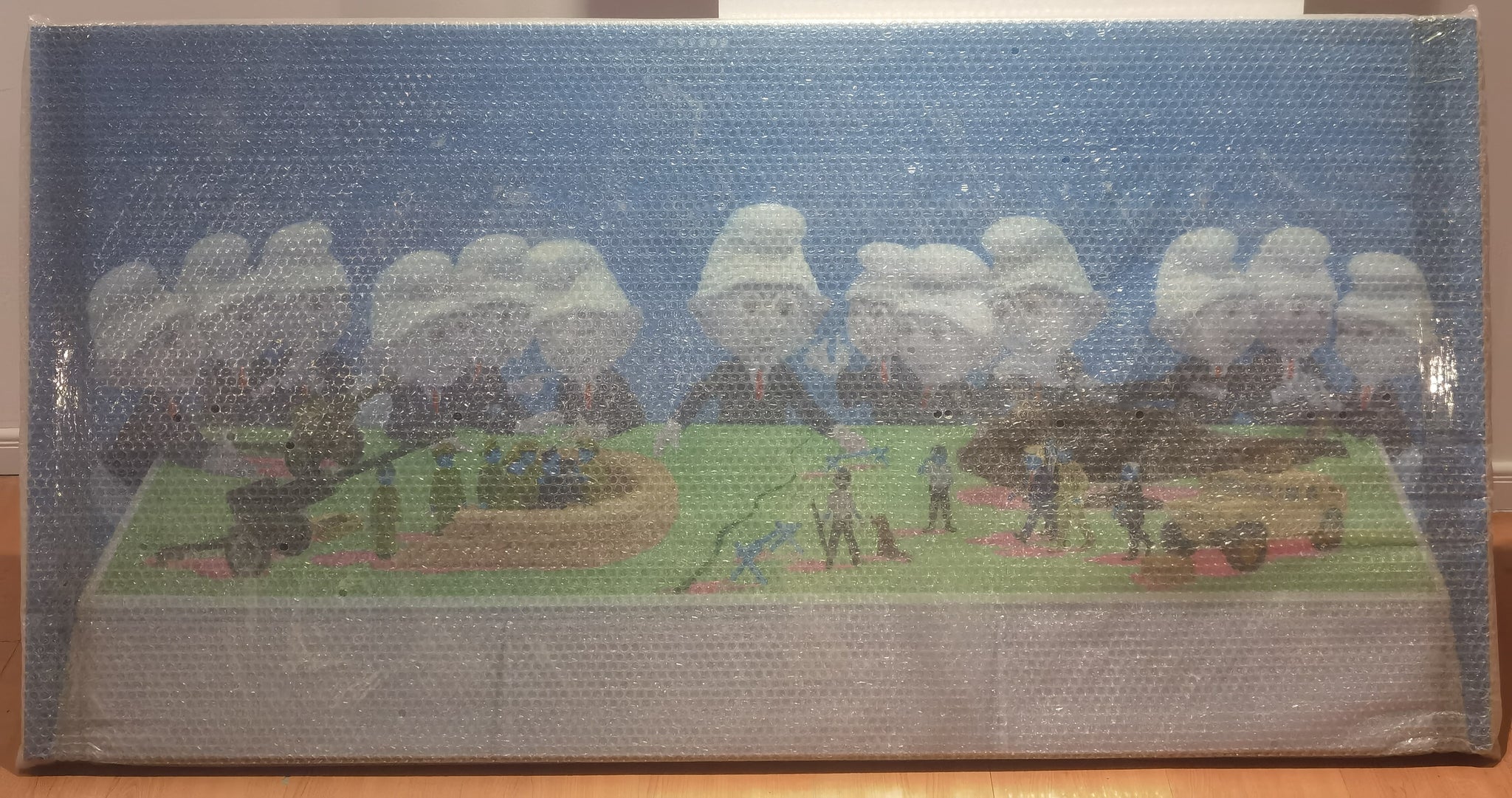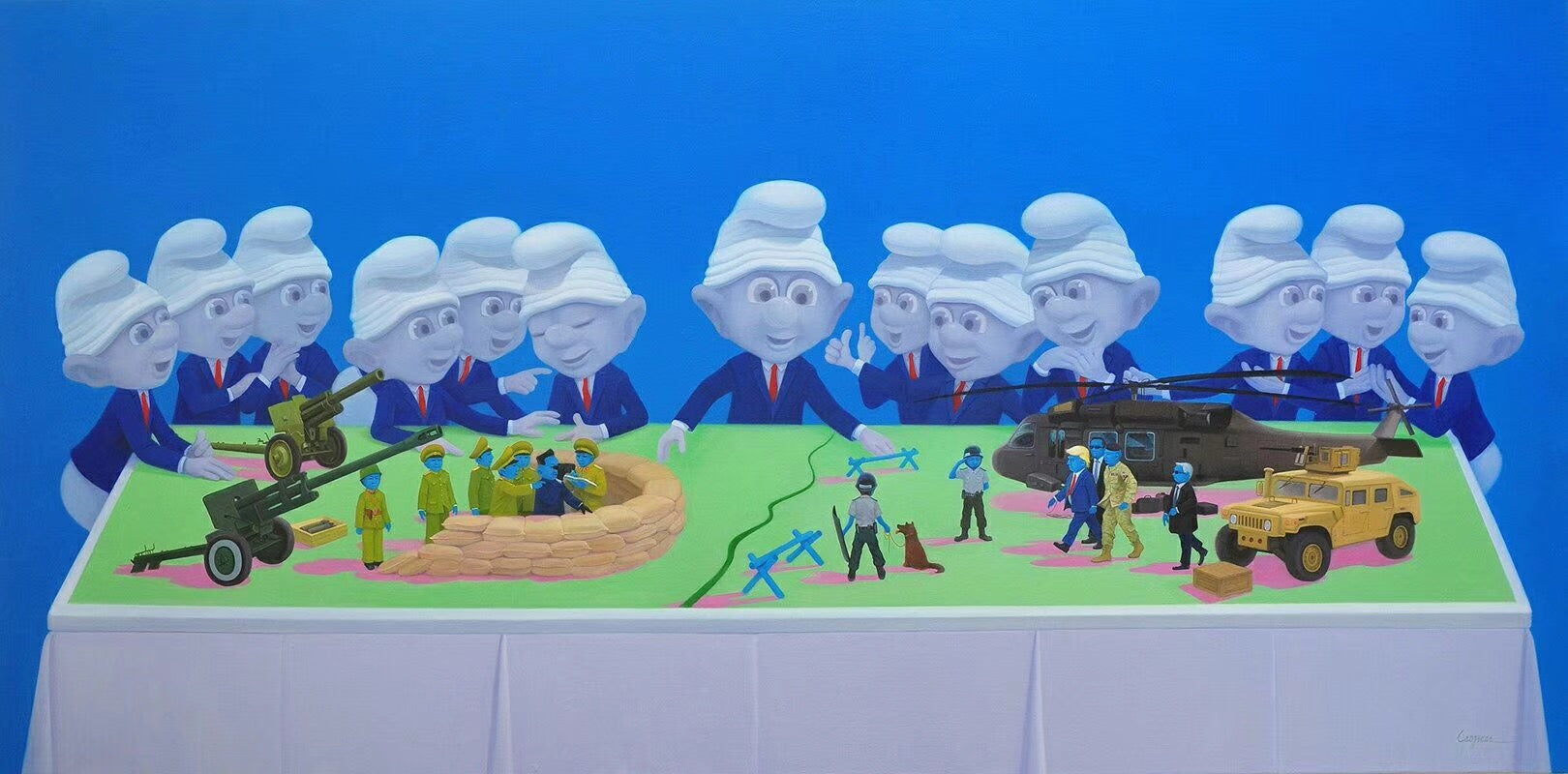 38th Line between North and South Korea is an oil on canvas by contemporary Chinese artist Cao Jicai, measuring 80 x 160 cm. The painting presents a surreal and satirical scene in which a group of near-identical, Smurf-like figures—distinguished by their iconic white hats—gather around a table orchestrating a miniature battlefield. The diorama represents the geopolitical division of the Korean Peninsula, complete with tanks, soldiers, helicopters, and trenches. With its cartoonish characters and toy-sized war theatre, the work explores the absurdity and detachment of military strategy in a hyper-stylized, almost childlike visual language.