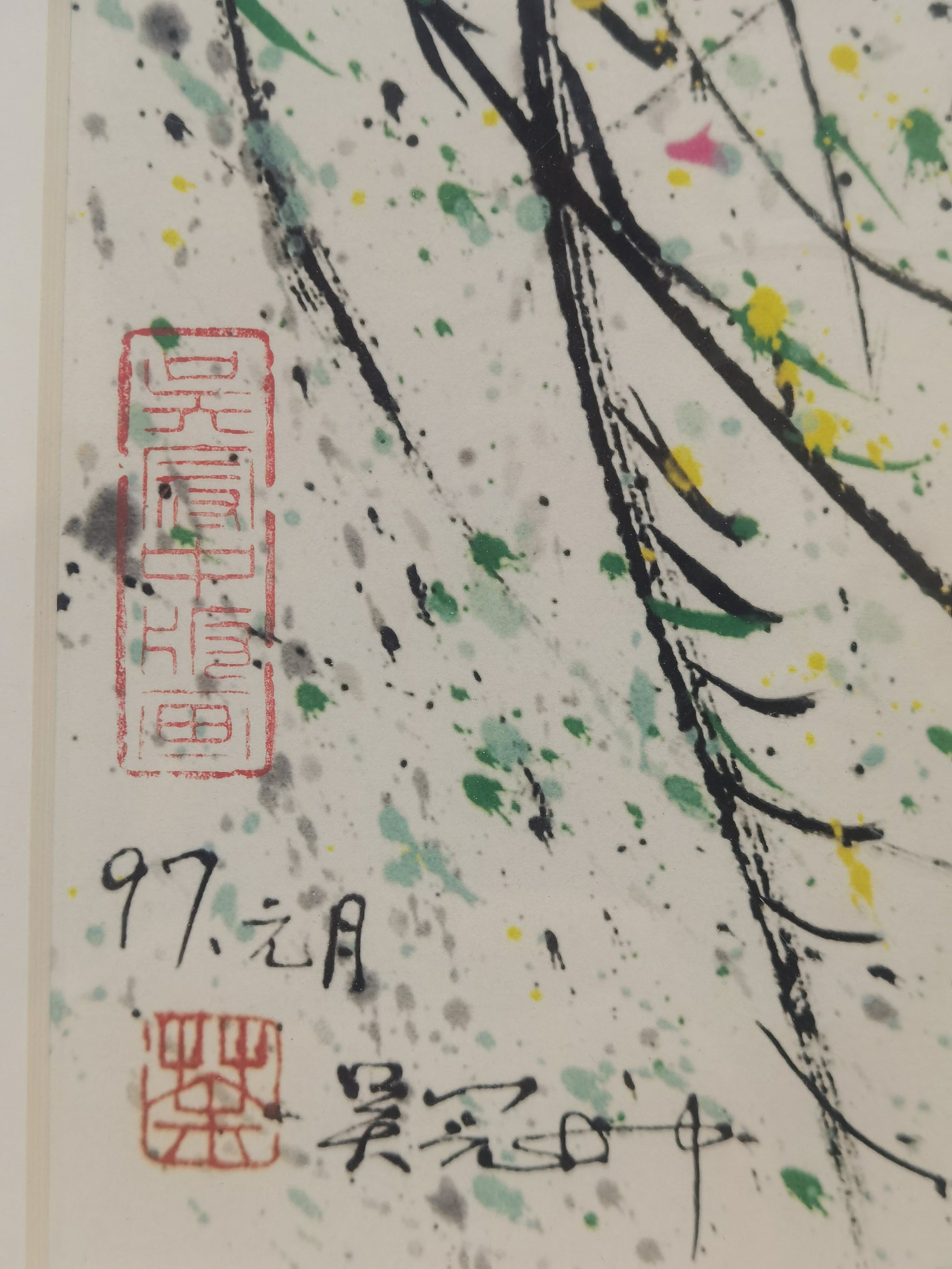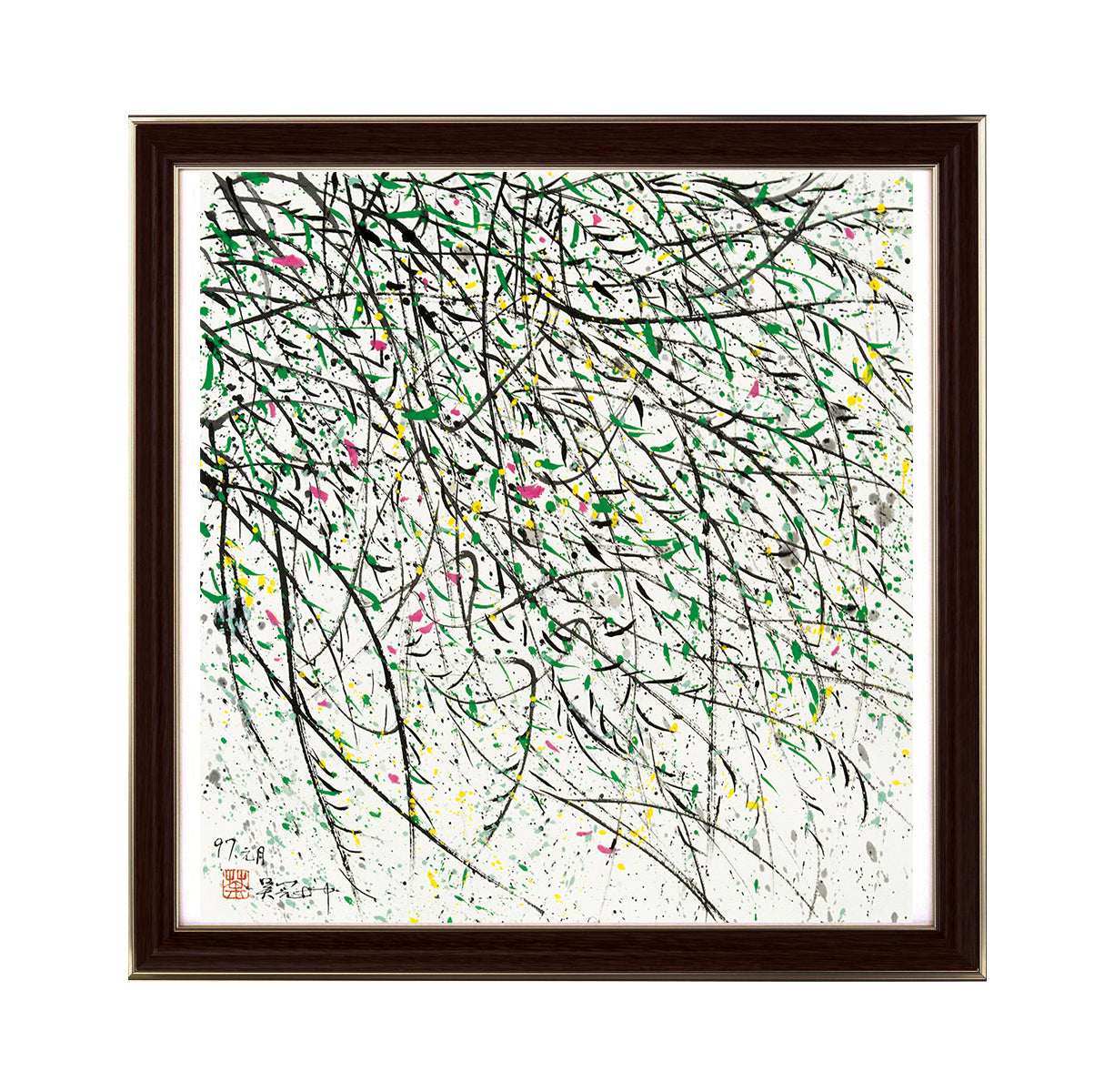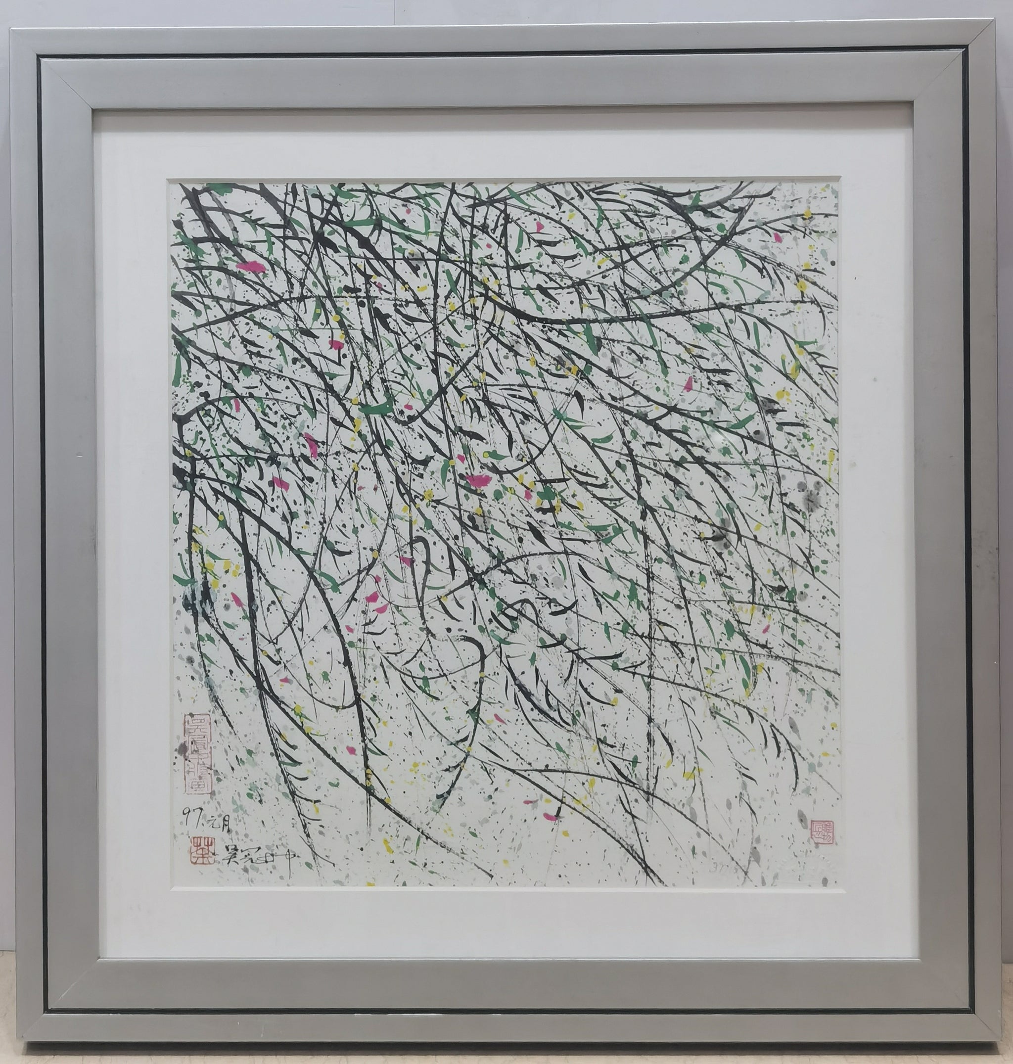 This piece exemplifies Wu Guanzhong’s masterful fusion of traditional Chinese ink painting with modern abstract sensibilities. His gestural, calligraphic lines evoke the literati brushwork tradition, while the rhythmic composition and color play echo the energy of Western modernists such as Jackson Pollock or the lyrical abstractionists. The use of vibrant dotting and splashes brings vitality to the scene, suggesting movement, renewal, and ephemeral beauty.