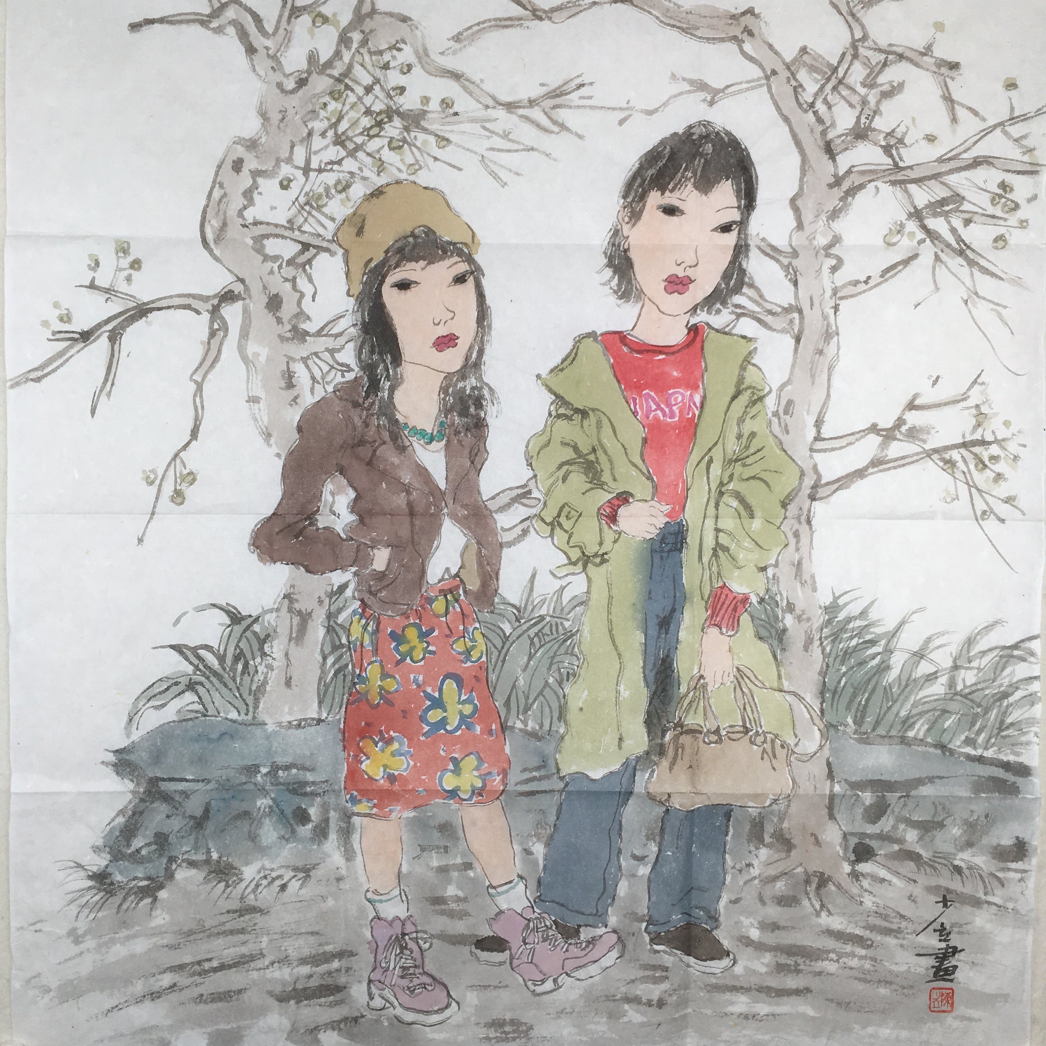 Fashion by Shaoli Chen is a vivid and playful portrayal of contemporary youth culture through traditional Chinese brush techniques. The composition features two young women in bold, fashionable attire, confidently posed against a backdrop of stylized trees and brush foliage. One figure wears a floral skirt and beanie, the other a green trench coat and denim, both exuding a distinct attitude and individuality. The work highlights Chen’s ability to capture modern subject matter with humorous nuance while retaining the grace of classical ink painting.