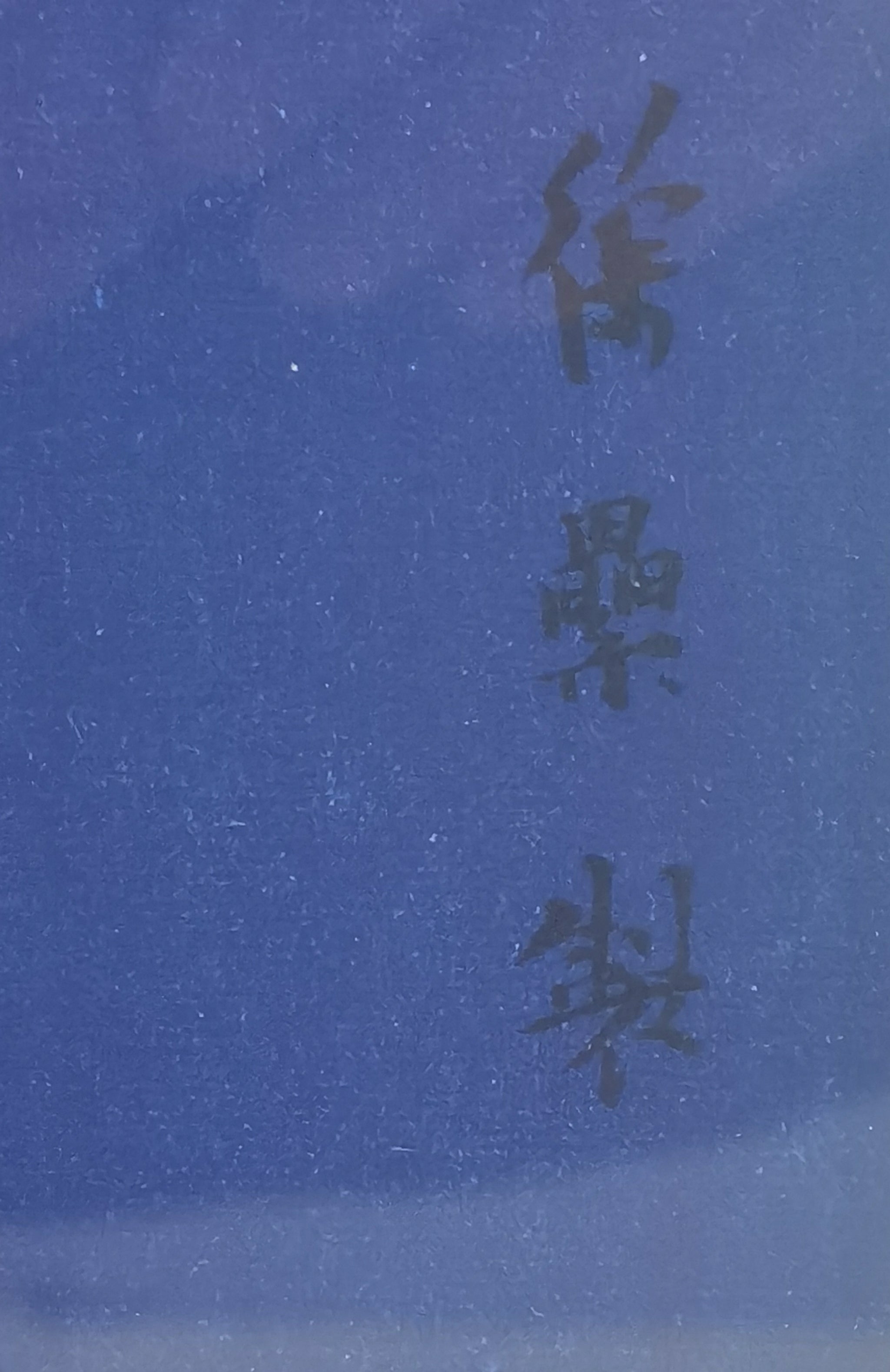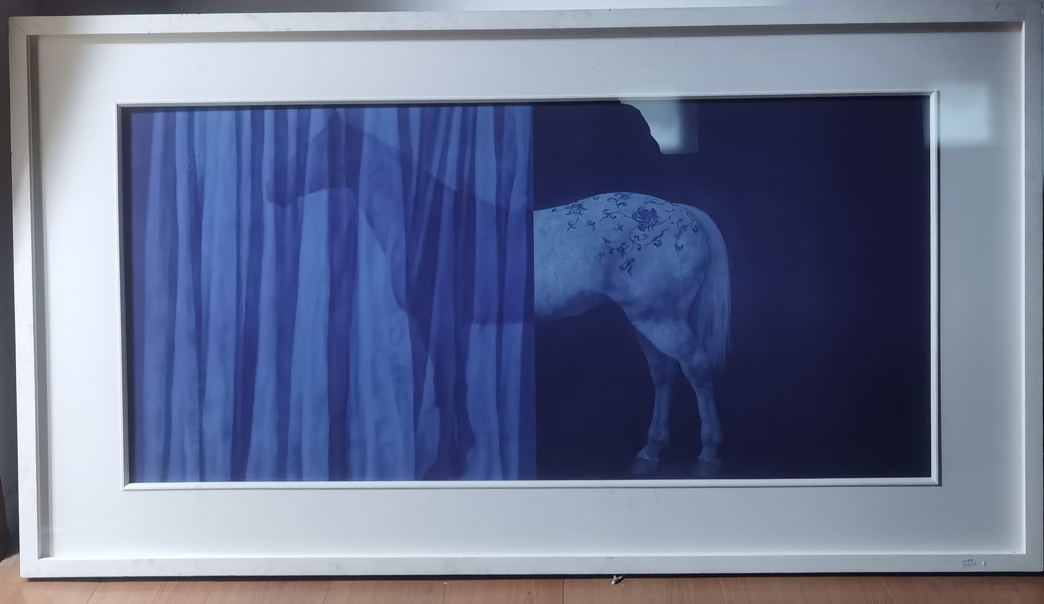 Half Edge is a striking silkscreen print by renowned Chinese artist Xu Lei. The composition presents a horse partially concealed behind a curtain, rendered in deep monochromatic blues. The juxtaposition of the visible and hidden creates a sense of mystery, inviting contemplation of presence, absence, and concealment.