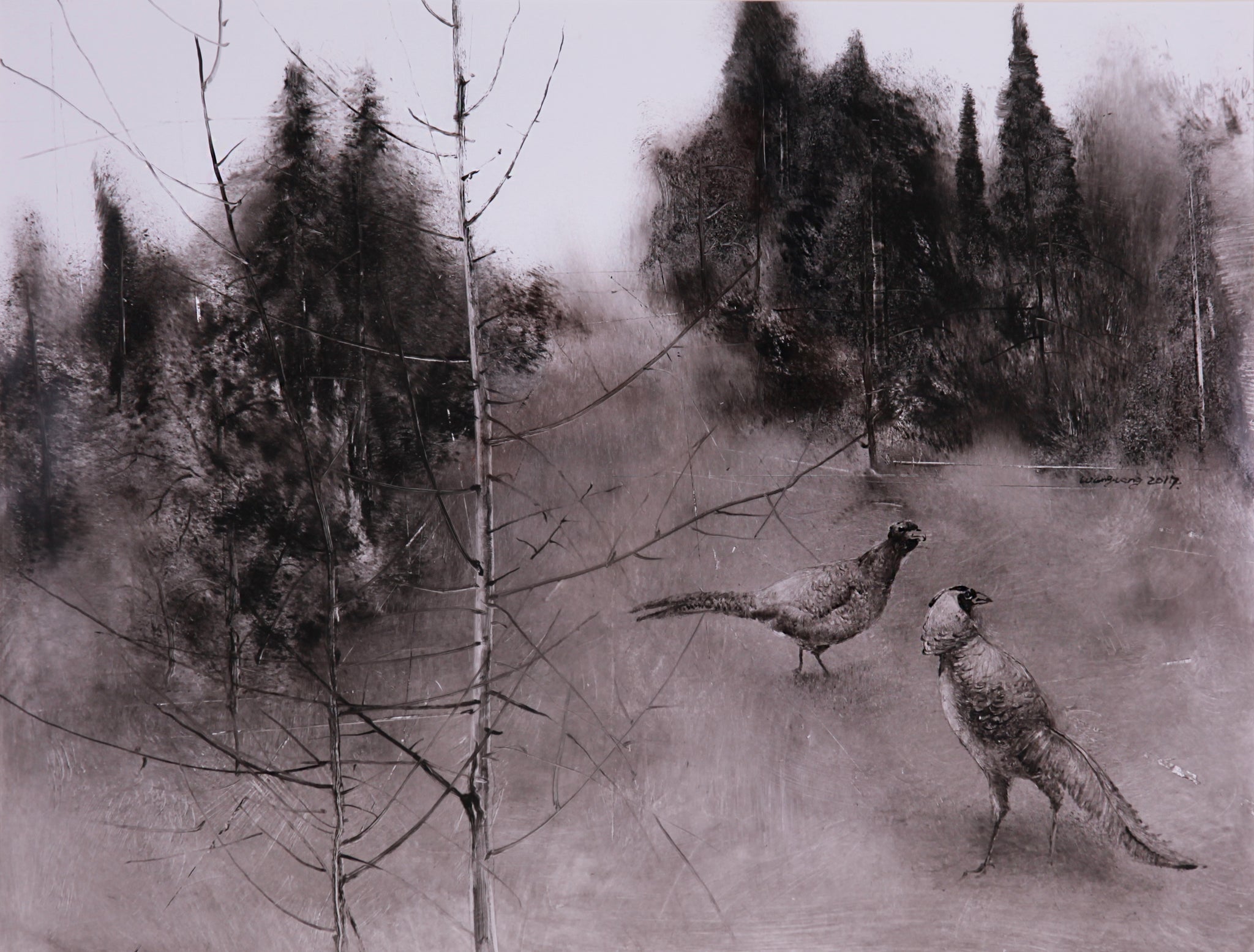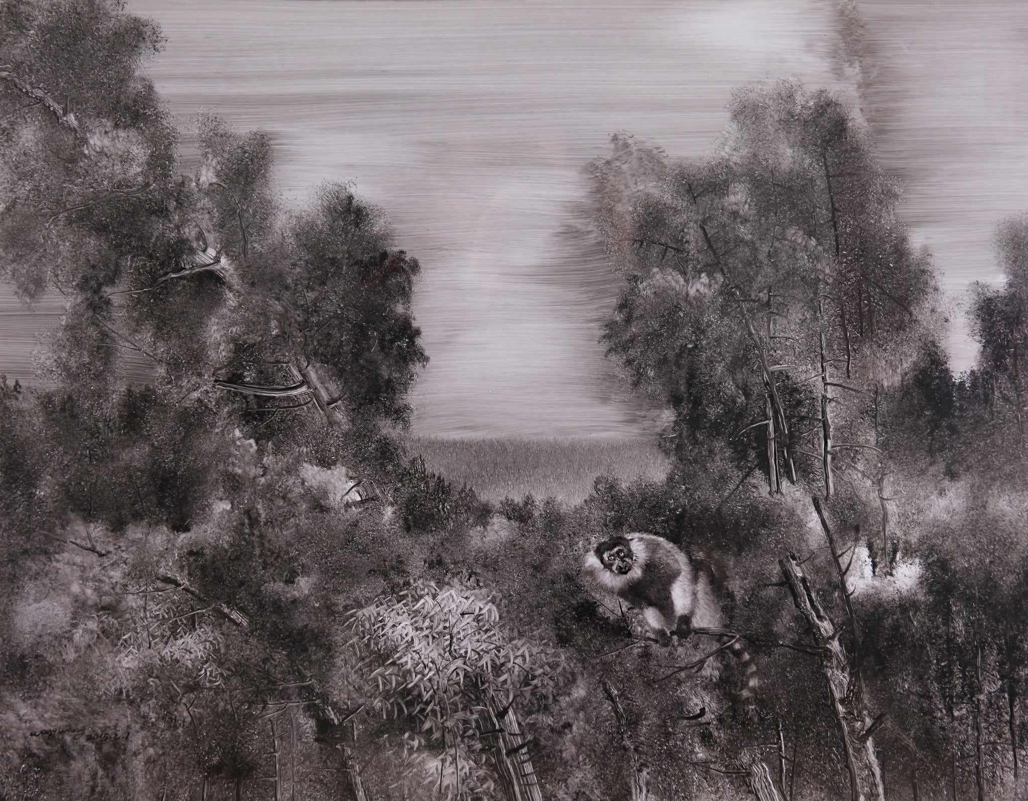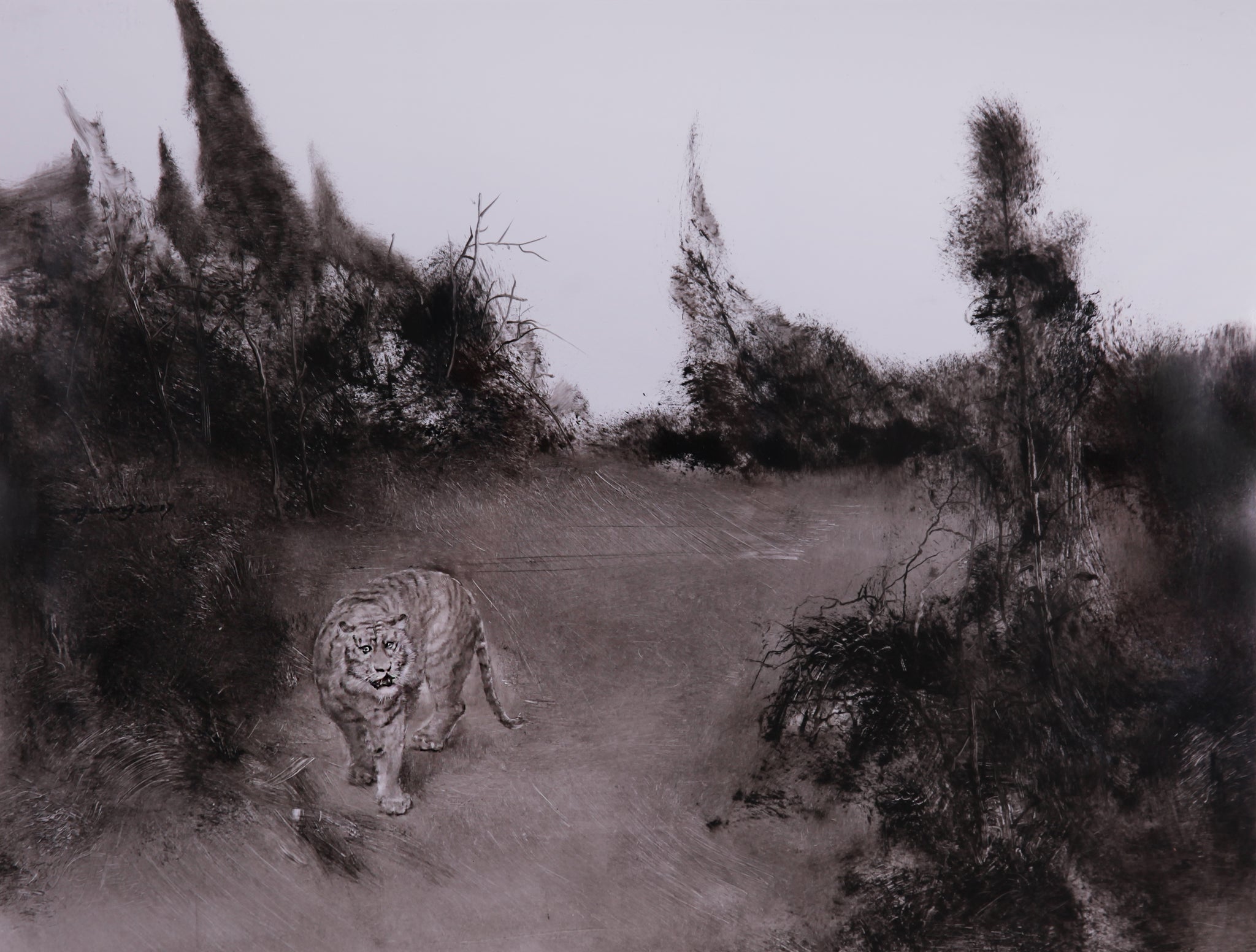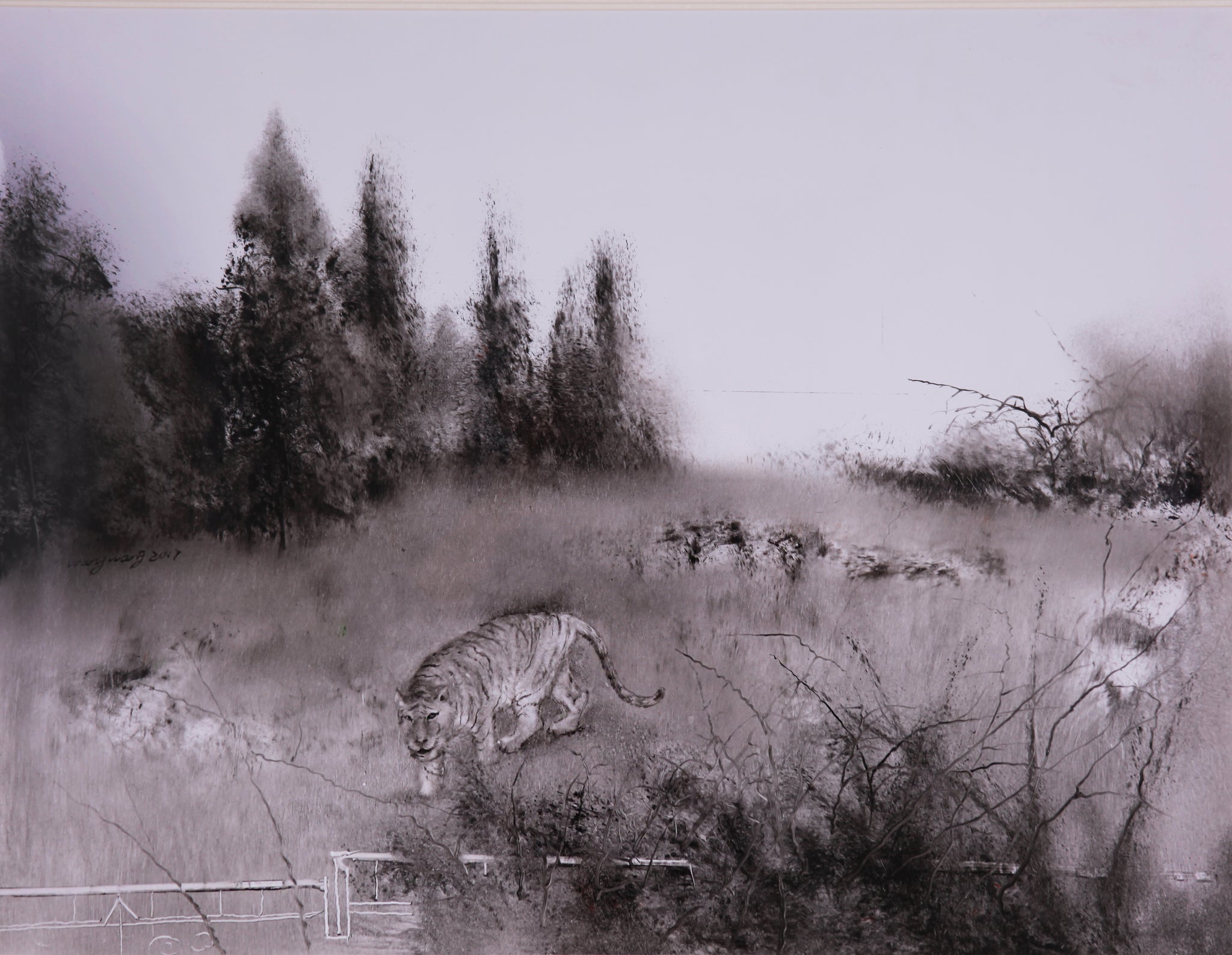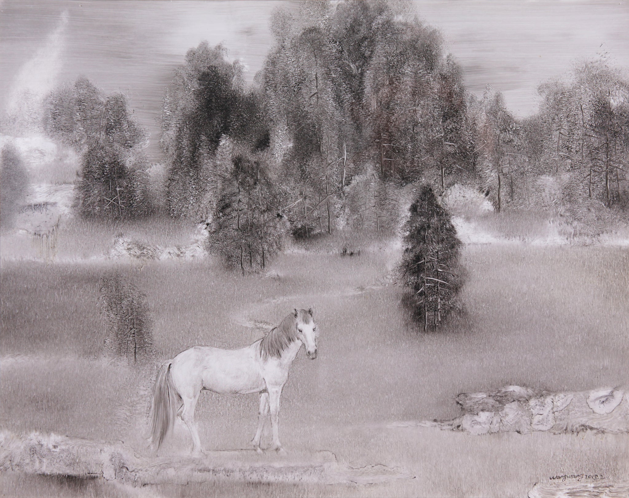 Wang Wang’s style is deeply influenced by classical Chinese ink painting traditions, adapted through oil on canvas with a contemporary sensibility. His use of grisaille technique evokes the softness and layering of ink wash, while retaining the physicality and depth unique to oil. The sparse, contemplative environments and quiet animal presences are reminiscent of Song dynasty landscape aesthetics, fused with modern tonalism and minimalist composition.